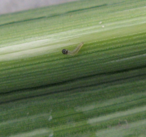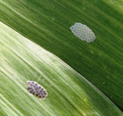 Figure 1. Egg masses of European corn borer.               Figure 2. Young larva of European corn borer.