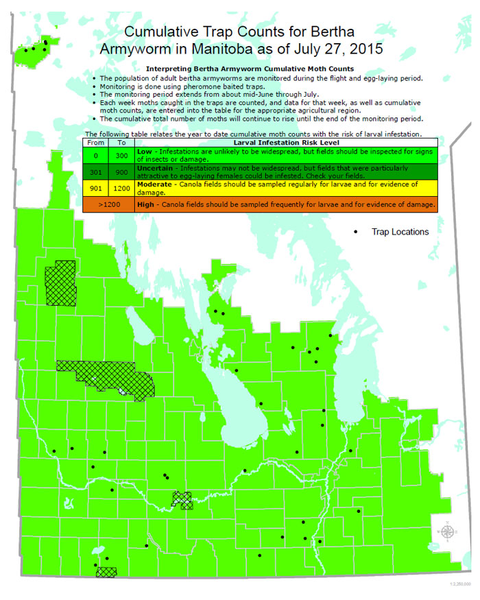 Bertha Armyworm: Pheromone-baited traps are used to monitor adult moths of bertha armyworm, and forecast areas that potentially could have higher levels of larvae later in the summer. The trapping period for this monitoring period is now finished. Anything under a cumulative count of 300 moths in the trapping period is considered lower risk.