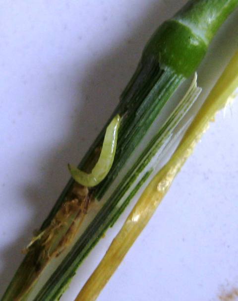 Figure 3. White head from wheat stem maggot. Figure 4. Larva of wheat stem maggot.