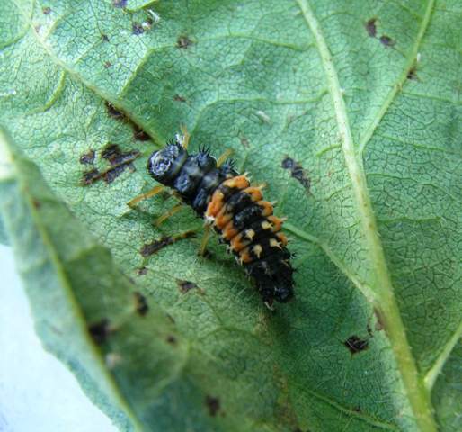 Common species of lady beetle that may be noted in soybean fields include the sevenspotted lady beetle, Coccinella septempunctata, and the multicoloured asian lady beetle, Harmonia axyridis. A study looking at predation rates by these two species of lady beetles on soybean aphids found that for sevenspotted lady beetle third instar larvae could each consume up to 105 aphids per day, adult females could each consume up to 115 soybean aphids per day, and each adult male up to 78 aphids per day when soybean aphids are high. (Environmental Entomology: 2009. 708-714). For multicoloured asian lady beetle, third instar larvae could each consume up to 112 aphids per day, adult females could each consume up to 95 soybean aphids per day, and each adult male up to 53 aphids per day when soybean aphids are high.