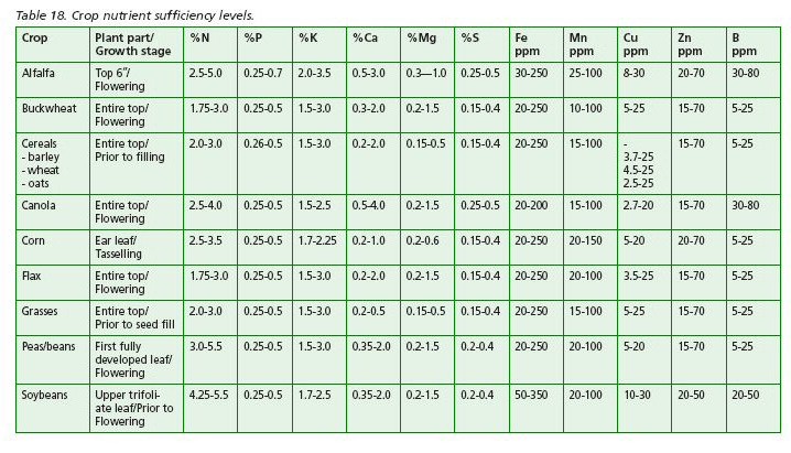 Table 18 provides the sufficiency levels of nutrients for many Manitoba crops at specific growth stages 44 . Nutrient levels below these sufficiency levels are considered deficient.