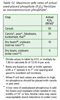 Monoammonium phosphate (11-52-0) has a low salt index and does not produce much ammonia, so it has relatively low toxicity to seedlings. Phosphate fertilizer banded near the seed (beside and/or below) results in the greatest yield increase per unit of P when recommended rates exceed that tolerated with seedplaced application. Such side-banded applications are recommended for most oilseeds, annual legumes and row crops. Deep banding phosphate at the 4-6" soil depth and in spacings of 12" or less before seeding or midrow banding during seeding are more effective in increasing yields than broadcast and incorporation methods. Banding nitrogen with the phosphate will increase fertilizer P availability. Band these fertilizers together when both N and P are needed. Application of 10 to 15 lb P 2O 5/ac with or near the seed may also be required to ensure adequate P supplies for early growth before roots can proliferate in the fertilizer bands. Application of additional phosphate with or near the seed may be especially beneficial when soils are cold and/or very deficient in P or when the phosphate is dual banded with a high rate of urea N in spring. Broadcast and incorporated phosphate results in the lowest yield increase per unit of P fertilizer. Broadcast application of P may be uneconomical on many soils, since the amount required in the first few years is two to four times that of seed-placed P to achieve similar yield increase. Crops such as flax may suffer reduced stands and yield when high rates of phosphorus are seed-placed. Recent studies demonstrate that modest rates of P can be seed-placed with flax without reducing yield. This rate of 20 lb P 2O 5/ac is sufficient to meet the crop removal of a 30 bu/ac flax crop.