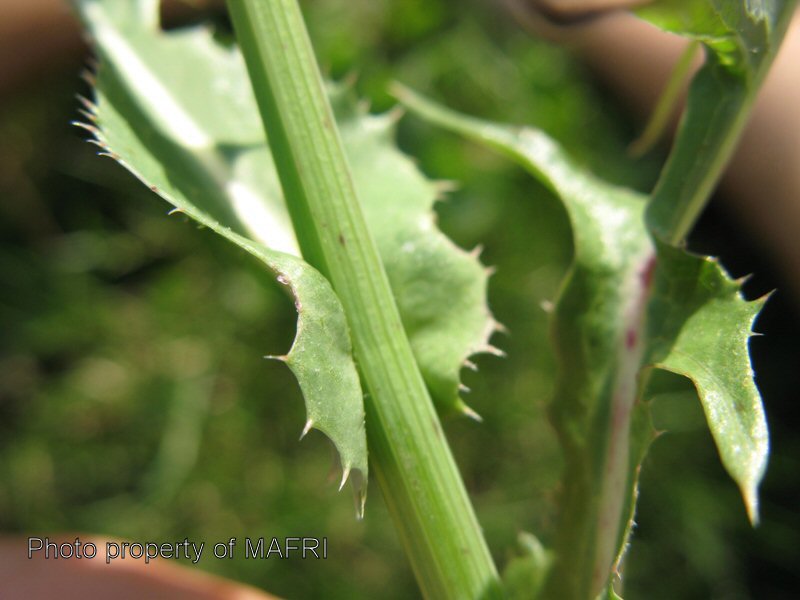 This is an annual weed, reproducing by seeds. The stems are erect, 1-4 ft. high, hollow, and glabrous. The leaves are alternate with spiny and deeply lobed margins. Lower leaves are petiolate while the upper leaves are sessile. Leaf veins may be purple. Flower heads are numerous, yellow, and appear in corymbs. The seeds are flat achenes, approximately 3 mm long, ribbed lengthwise, brown, with a pappus of white hair at one end. This weed germinates anytime between spring and fall when conditions are suitable.