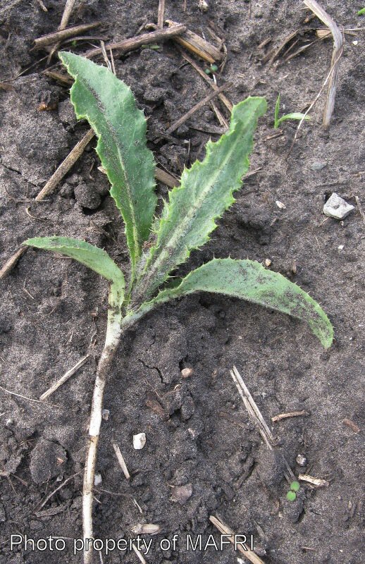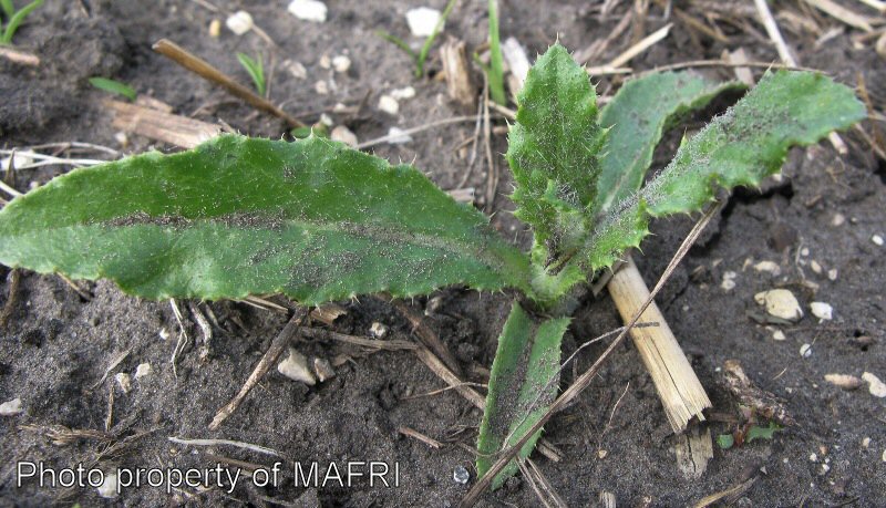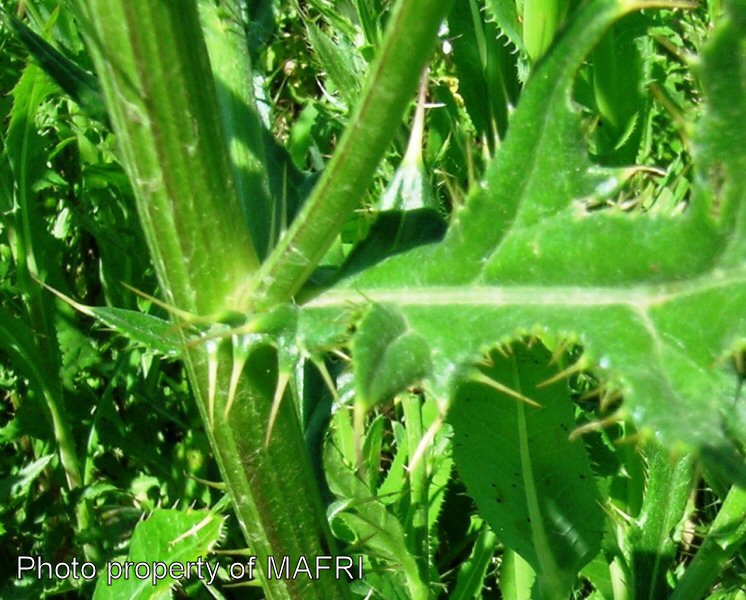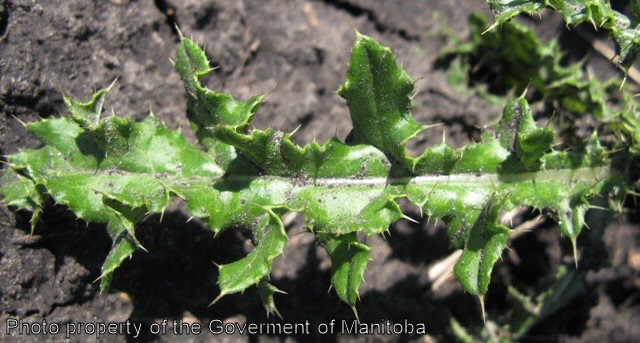 The seedling has oblong cotyledons. The leaves are oval to spear-shaped. The margins have numerous triangular indentations and sharp spines. The seedlings are weak competitors if they are shaded by the crop.