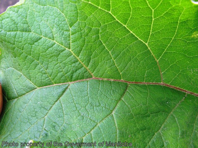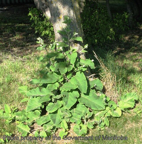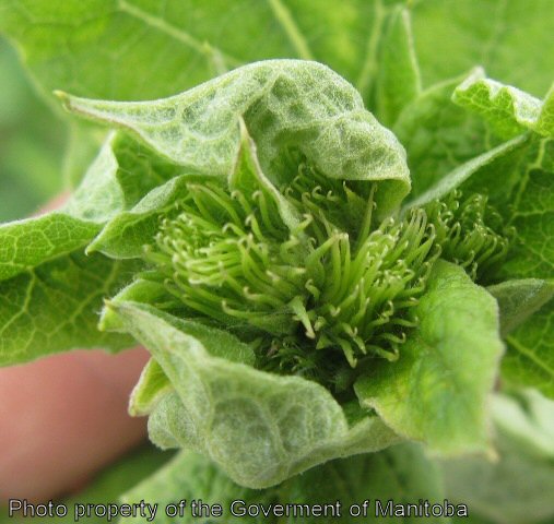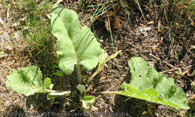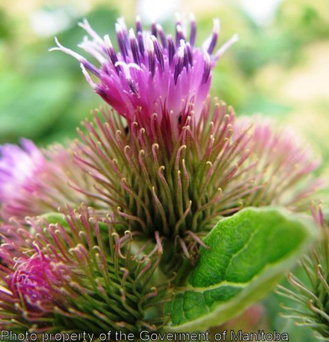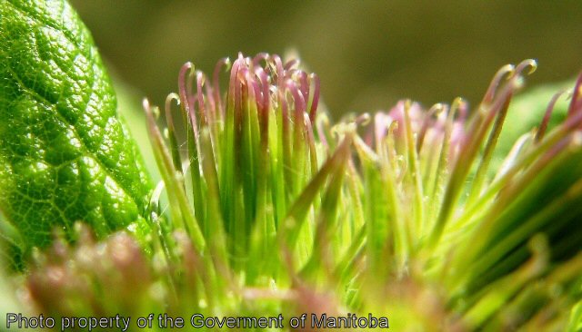 Common burdock is a biennial weed, reproducing by seed. The stems are erect, up to 2 m tall, coarse, branched, and thick. The leaves form a basal rosette the first year. When mature the leaves are alternate, triangular in outline, petiolate, and dark green. The leaf margins are coarsely and shallowly toothed. The flower heads are purple, stalked, 1-1.5 cm thick, numerous, and occur at the ends of branches and axils of upper leaves. The tubular florets are surrounded by bracts and hooked spines making the seed head into a bur. The seeds are 5-6 mm long x 2.5 mm wide, greyish- brown, wedge-shaped, and curved on one or both sides. Seed dissemination is facilitated by the weeds bur-like head.