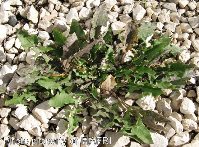 Herbicides are available for control of dandelion seedlings in cereal crops. Established dandelions can be controlled with glyphosate applied pre-seeding or post-harvest, but pre-harvest treatments are the most effective. There are no herbicides registered for control in alfalfa. Rotating the field out of forages may be required on these fields.