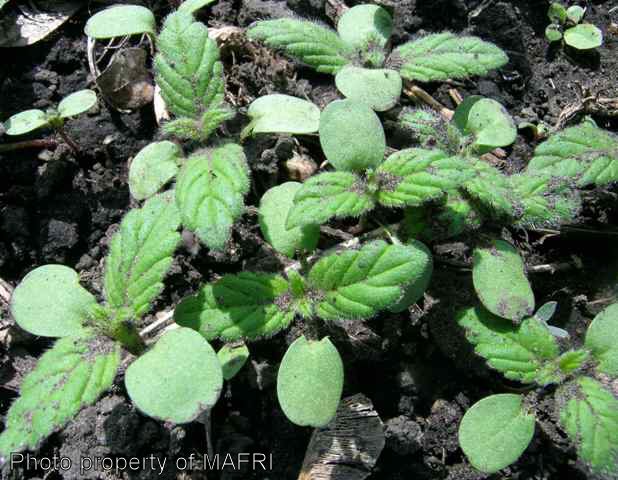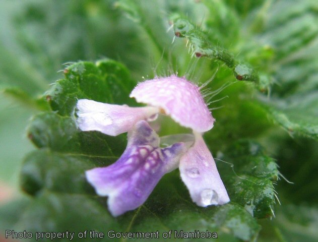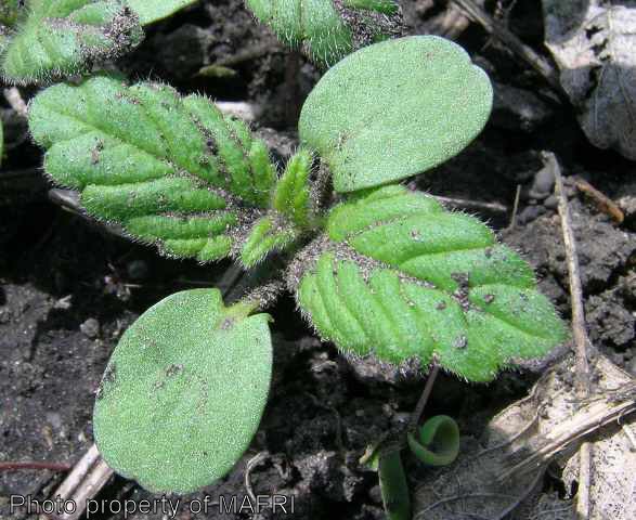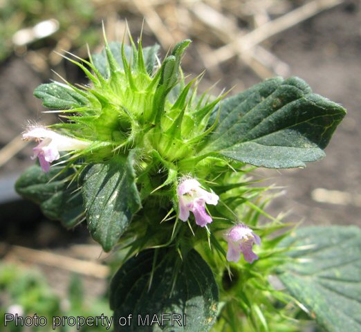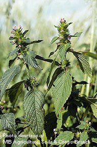 An annual, reproducing by seeds, this weed has stems that are square and covered with bristly hairs. The stems are 30-75 cm (12-30 in.) high and are swollen at the nodes. The leaves are opposite, 5-10 cm (2-4 in.) long, coarsely toothed, hairy, and long-stalked. The flowers are clustered in the axils of the upper leaves and are white or pink, suffused with purple. The seeds can remain dormant for long periods of time, making it hard to manage this weed once it becomes established.