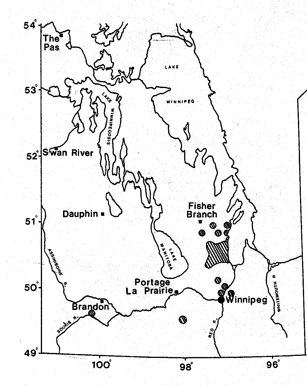Red bartsia (Odontites serotina) is a weed of hayland, pastures and roadsides which appeared in the Interlake region of Manitoba in the 1950s (Figure 2). The weed apparently was introduced into the area in crates which were shipped from West Germany into the Canadian Armed Forces Base at Gimli. The infestation started on the base and spread into surrounding farmland by way of mowed hay from red bartsia infested areas along the edges of runways. Today the main area of infestation (Figure 1) is in the eastern Interlake particularly in the triangle formed by Gimli, Fraserwood and Meleb. New infestations have recently been found in the Souris and Carman areas. Isolated patches have also been found near Stonewall, Selkirk and Winnipeg. |