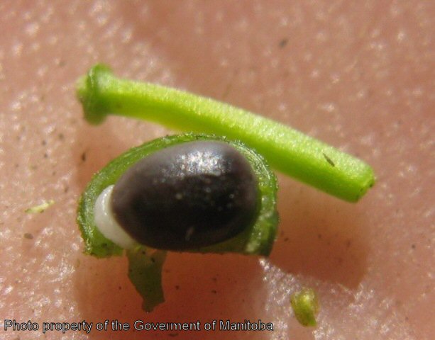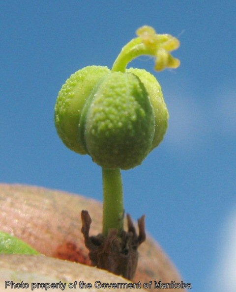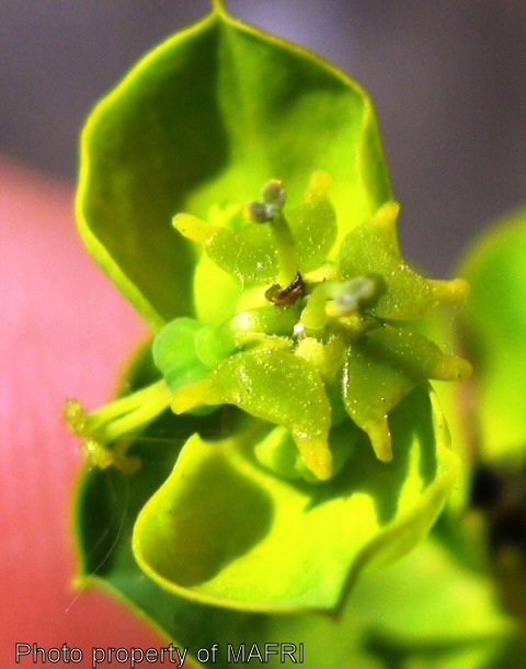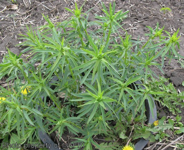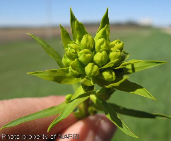 A perennial weed, reproducing by seeds and creeping rootstocks. The stems are erect, to 1 m tall, glabrous, and contain latex. The leaves are alternate, sessile, spirally arranged, light green, linear to linear-lanceolate, and contain latex. A whorl of leaves marks the start of the flowering portion of the stem. The flowers are unisexual, small, greenish, lack petals and sepals, and occur at the tips of stems in umbel-like clusters. Both male and female flowers exist on the same plant. The seeds are about 2.5 mm long, smooth, greyish-yellow or brownish, 3 per capsule, with a yellow lump near the base.