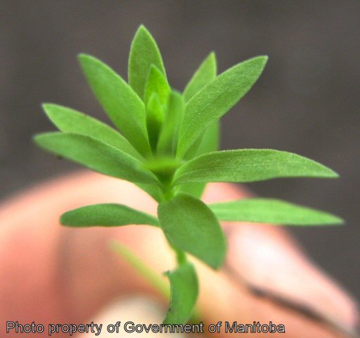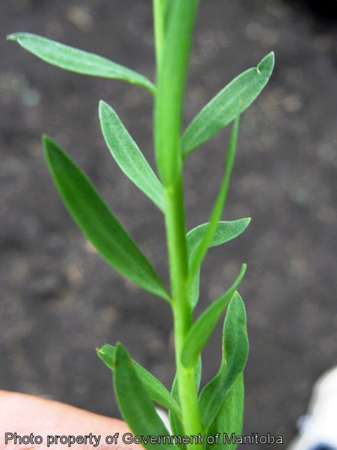 This weed is an annual, reproducing by seeds. The stems are erect and capable of tillering. The leaves are long, narrow, linear-lanceolate, and sessile. The first few leaves are opposite and later become alternate. The flowers are symmetrical, blue, and occur at the ends of stems and tillers. The seeds are small, shiny brown, tapered at one end and rounded at the other, approximately 5 mm long x 2.5 mm wide, and borne in a round capsule called a boll. Seeds are short lived in the soil, surviving only 1-3 years.