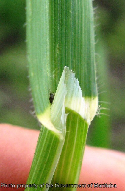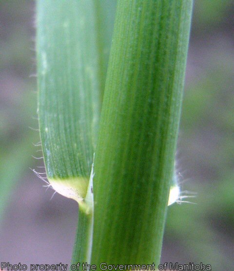 Take a minimum of 20 weed counts across the field. The key to identifying wild oats from wheat and barley is to look for the presence or absence of auricles (ear-like appendages wrapping around the stem where the leaf joins the stem). Wheat and barley possess auricles, while wild oats do not. Although this weed is usually randomly spread across a field, carefully check any low spots in the field for patches of wild oats, as wild oat prefers moist soils.