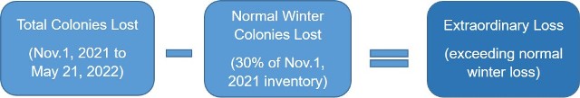 The extraordinary loss is the number of colonies that exceeds the normal (>30%) portion of the winter loss mortality from November 1, 2021 to May 21, 2022.