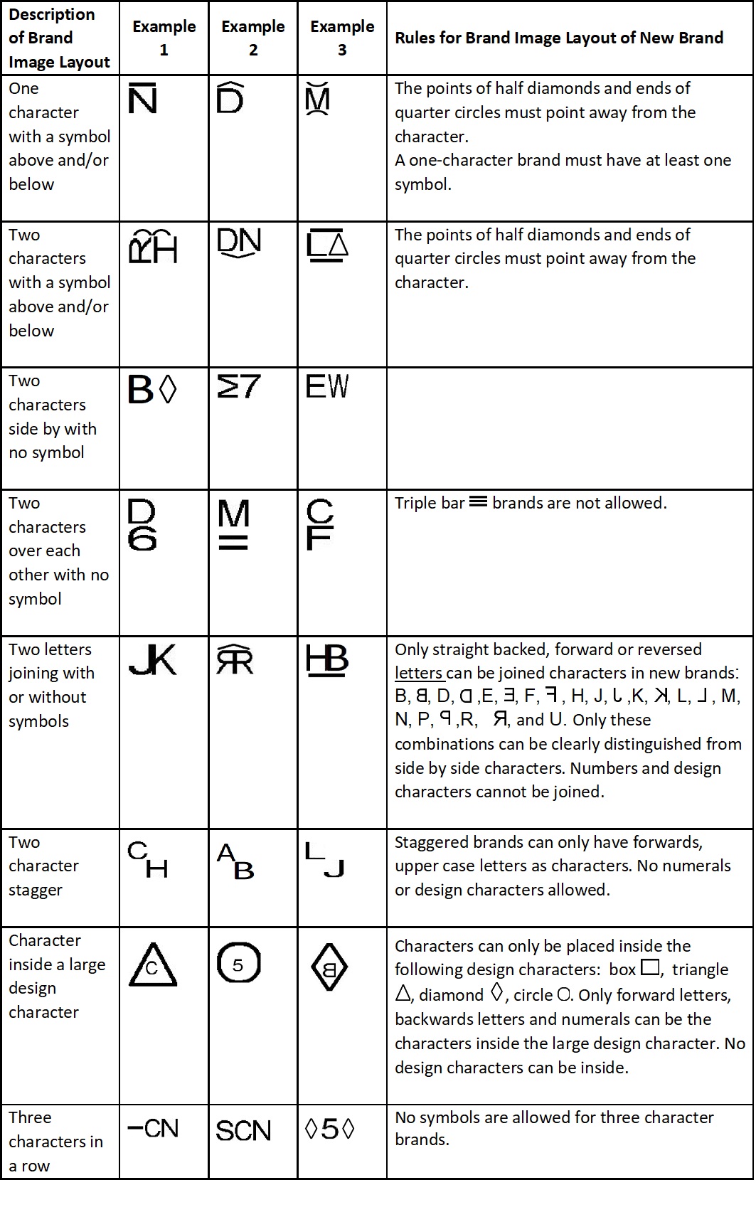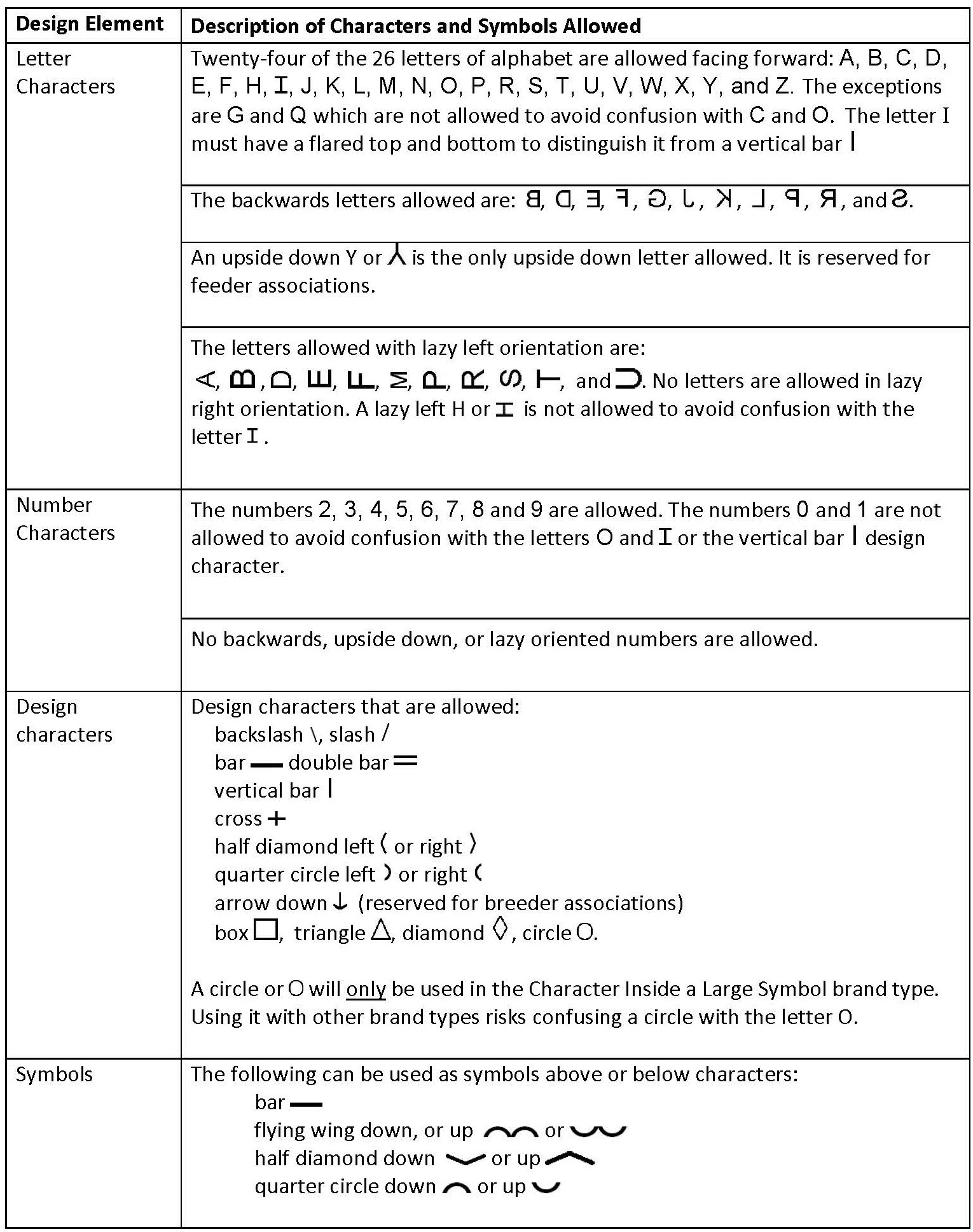 The designs for brands consist of characters, often with symbols positioned above and/or below them. All new brands must meet rules for the types of characters and symbols used. Characters are limited to specific letters, numbers, and design characters. Depending on the letter of the alphabet, letter characters may be oriented in the forward, backward or lazy left (lying on left side) position. Only specific design characters such as an arrow or triangle are allowed. The brand layout must also comply with rules for how these characters and symbols are positioned and grouped together in the brand design.