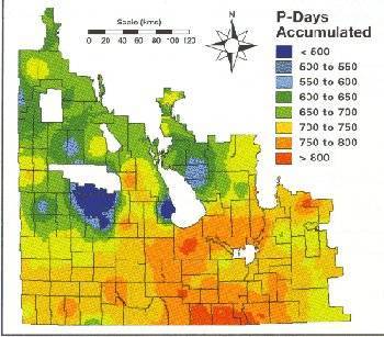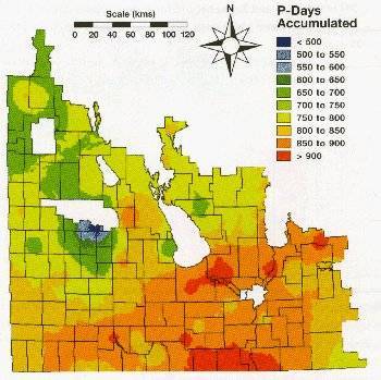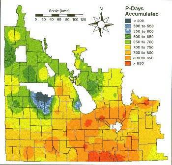 The highest average accumulation of P-days, 900 to 950, occurs in the very southern part of the Red River Valley in the municipalities of Franklin, Montcalm, Rhineland and Stanley, and a small area just to the east of Portage la Prairie. Most of the area to the south and east of a line from the southern end of Lake Manitoba to a point just to the east of the Manitoba Saskatchewan border has 850-900 average annual P-days. The remainder of the province has fewer than 850 P-days.