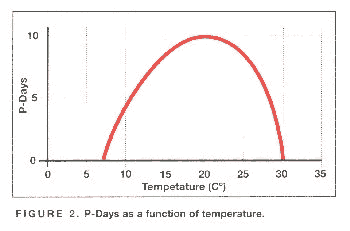 Each crop is very specific as to its heat requirements. The minimum temperature for potato growth and development is 7 'C (45 'F), while the most rapid growth and development takes place at 2l 'C (70 'F). The growth rate decreases with the increase in temperature and finally stops at 30 'C (86 'F). From this information, heat units for potatoes, called "P-Days" can be calculated. The relationship between P-days and temperature is shown graphically in Figure 2.