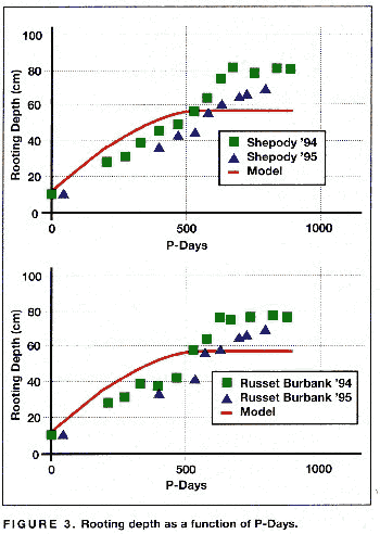 Some studies have been done locally to examine the relationship between potato growth and development and P-days. Figure 3, for example, shows how the depth of root penetration depends upon accumulation of P-days. About 400 Pdays are required for roots to grow to a depth of about 40 cm (16 inches), and about 700 P-days must accumulate before roots reach their maximum depth of about 65 to 80 cm (25 to 31 inches). At a given point in time, the volume of soil from which the plant can extract water and nutrients can be estimated from P-days accumulation.