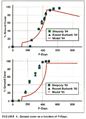 Figure 4 shows how the plant canopy grows with the accumulation of P-days. After about 450 P-days, there are enough leaves to completely cover the ground. Knowing the degree of ground cover is important because the greater the proportion of the ground covered with plant leaves, the greater the water requirement of the crop. Thus, P-days can be helpful in estimating the daily as well as seasonal water requirements of the crop.