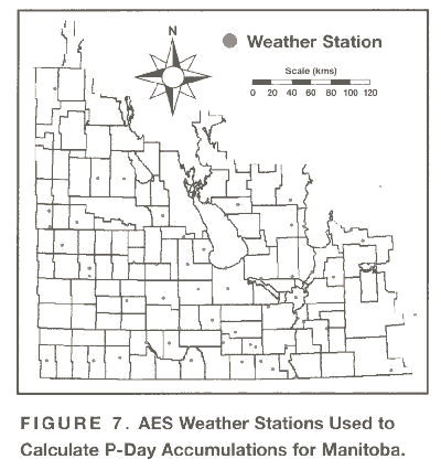 The accumulation of heat useful to potatoes, P-days, is calculated from historical climatic data. It was assumed that potatoes were planted on the same date as wheat, thus historical wheat seeding dates from Statistics Canada were used. P-days were calculated from those planting dates to the date of the first fall frost. In these calculations, daily data for the period 1961 to 1990 from 65 weather stations in Manitoba were used. Because there is considerable year to year variation in useful heat accumulation, average, 75% and 90% probability values were calculated for each weather station.