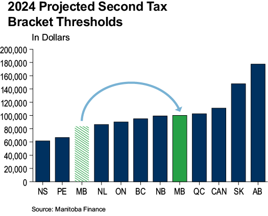 With the increase to $100,000, Manitoba’s second tax bracket threshold is projected to rise from third-lowest among provinces to fourth-highest in 2024.