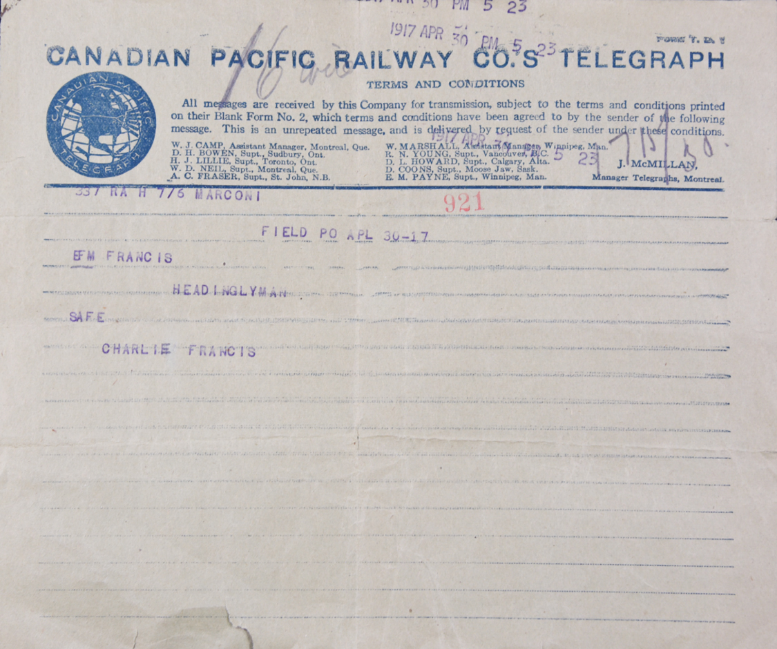 Telegram from Charlie Francis to his family in Headingley weeks after the Battle of Vimy Ridge, 30 April 1917, P304/2.