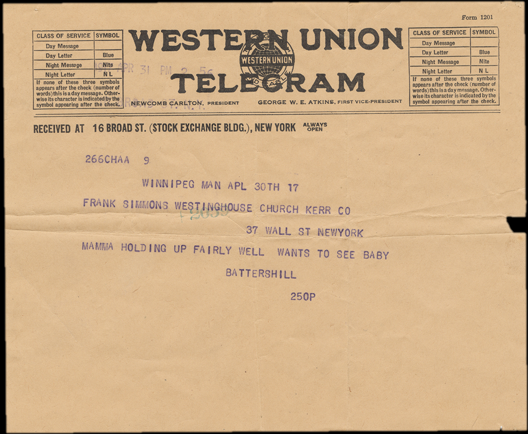 Telegram from John Battershill to his daughter Mrs. Frank (Amelia) Simmons, 23 April 1917, P7472/2.