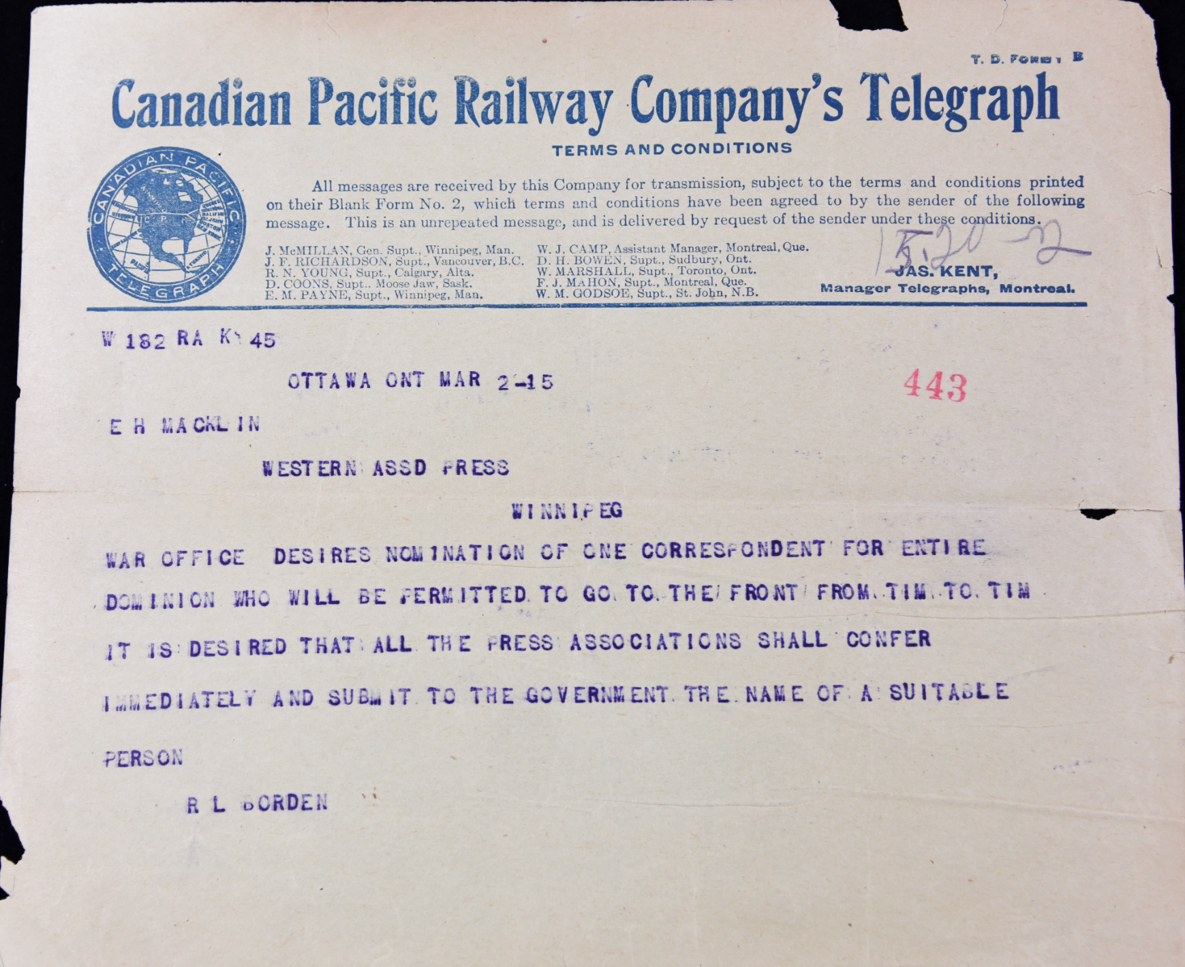Telegram from E. H. Macklin, general manager of the Winnipeg Free Press, to Livesay re the possibility of Livesay becoming a war correspondent, 3 March 1915, P7595/7.