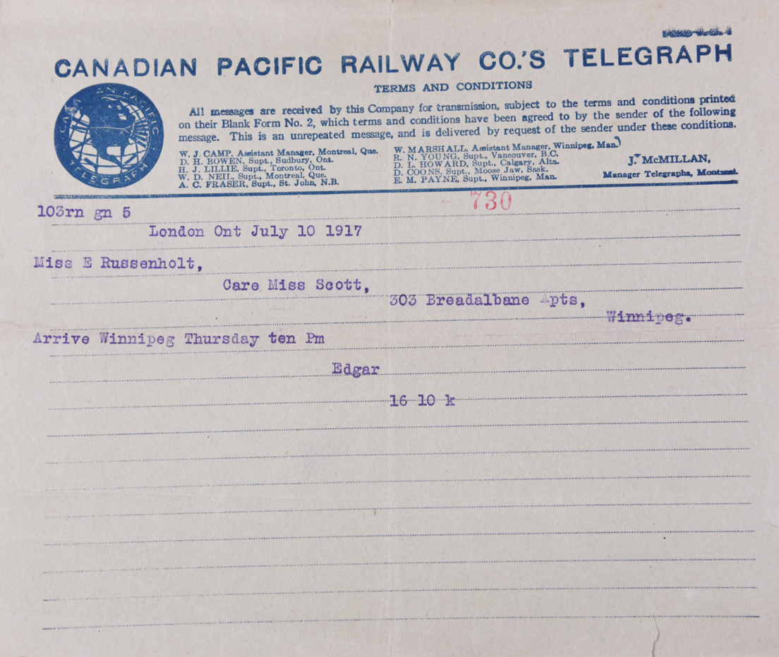 Telegram to Drusilla Russenholt regarding her brother Edgar Russenholt's return to Canada after being wounded in the First World War, 6 July 1917, P2828/5.