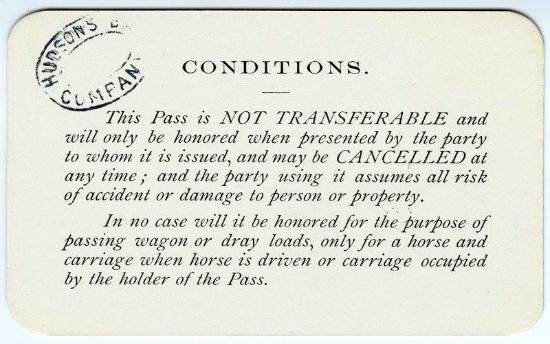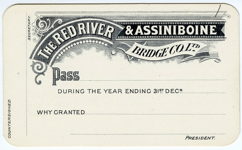 ![Photo of the front of the Bridge Pass. “The Red River and Assiniboine Bridge Co. Ltd. Pass: [blank line] During the year ending 31st Dec:[blank line] Why granted: [blank line] President [signature line] Countersigned: Secretary [signature line] ”](../../_assets/images/hbca/spotlight/broadway_bridge_pass_front_sm.jpg)