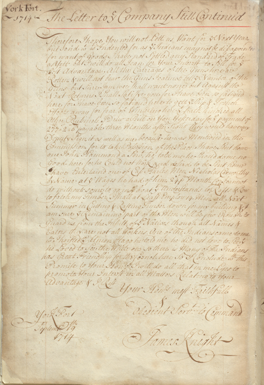 A good example of this broader perspective is found in a copy of Knight’s letter to the Governor and Committee dated 19 September 1714. Knight’s letter indicates that he was suspicious of the continued influence French traders had with the local Aboriginal community. Here he relays that: