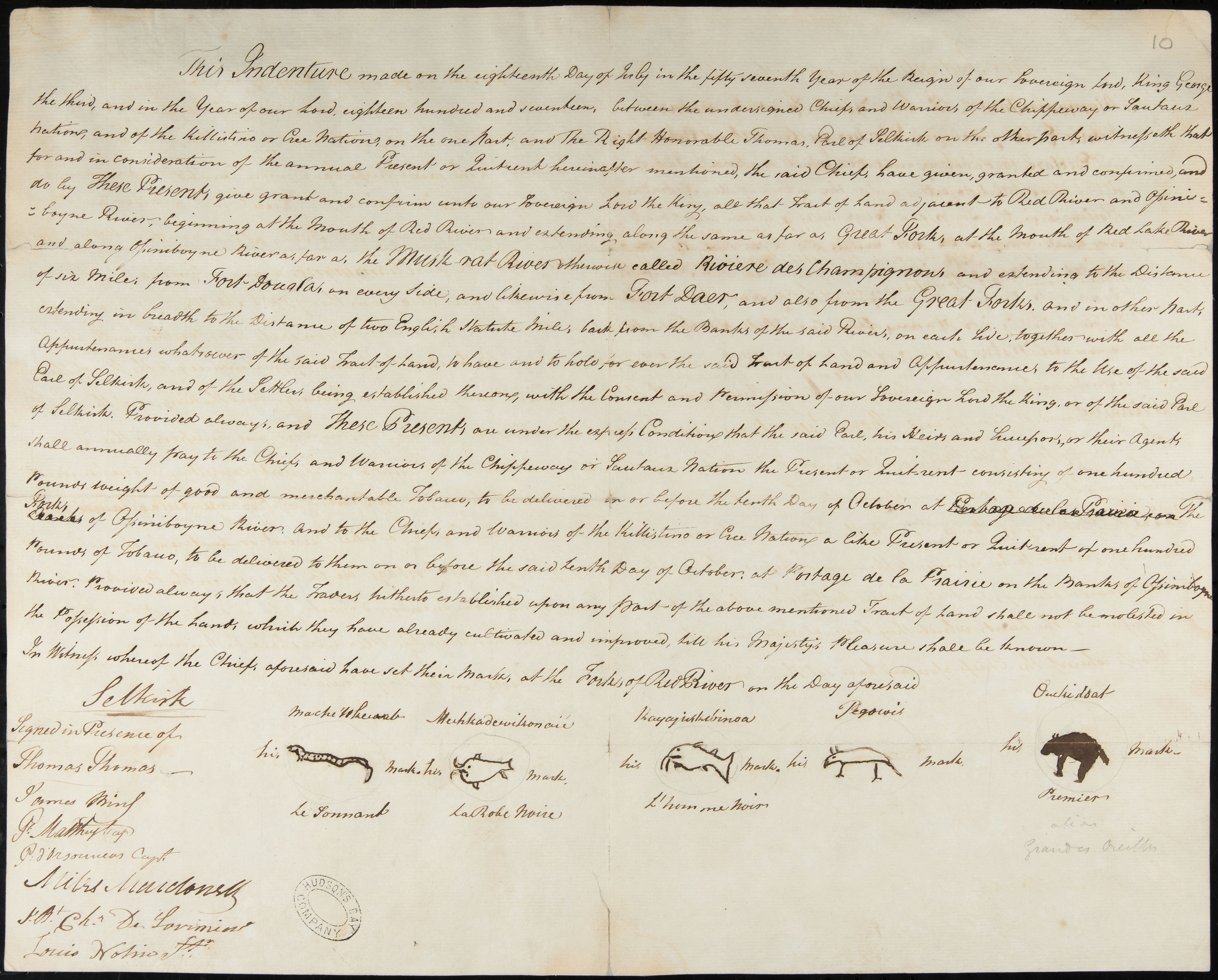 On July 18, 1817, Lord Selkirk signed the treaty with 5 leaders referred to in the document as “Chiefs and Warriors of the Chippeaway or Sautaux Nation, and the Killistine or Cree Nation.” It has become widely known as the Selkirk Treaty. This is the first formal written agreement in Western Canada recognizing Indigenous land rights. It was superseded by Treaty I in 1871.