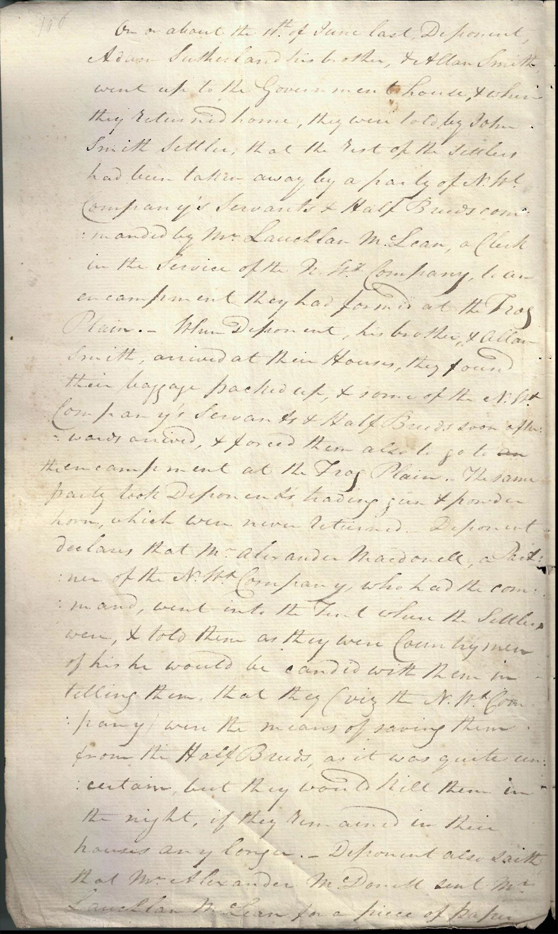 George Sutherland and his family had been Red River settlers at the time of the alleged NWC activities. In his deposition, pictured below, Sutherland recounts the events leading to his eviction, explaining that in early April 1815, he received a note from Captain Duncan Cameron of the “Voyageur Corps” demanding he “give up [his] musket in the King’s name”. Sutherland refused to hand over his gun and as a result, NWC men arrived to seize his musket by force and remove him and his family to a make-shift prison at an encampment on the Frog Plain (present-day neighbourhood of West Kildonan in Winnipeg). The deposition also notes witnesses who affirmed that Sutherland’s “property was taken from him by force.”