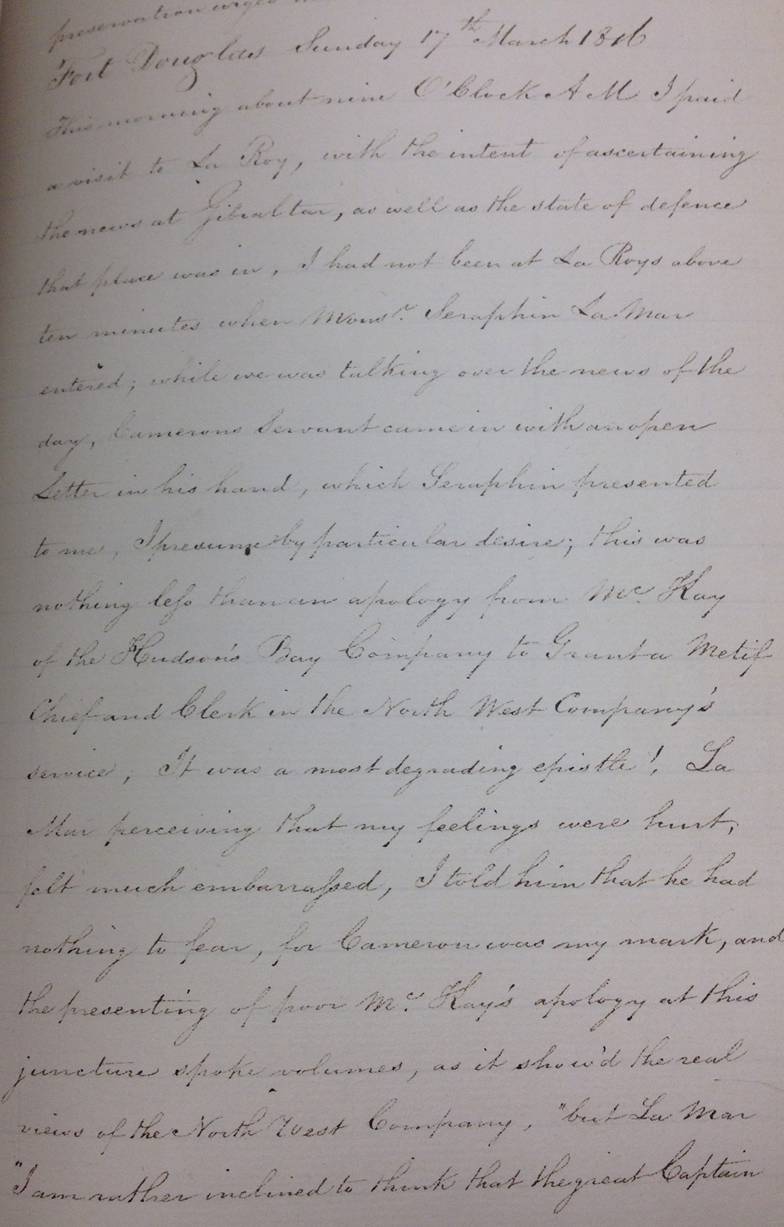 After the Pemmican Proclamation in 1814, tensions escalated between the Hudson’s Bay Company (HBC) and the North West Company (NWC). HBC’s Fort Douglas and NWC’s Fort Gibraltar were both on the banks of the Red River, near the Forks. Colin Robertson, who was in charge of Fort Douglas at this time, recorded his thoughts and observations in several personal diaries. By looking at his diaries, one can see the increase in hostility between NWC and HBC, particularly when rumours started to fly.