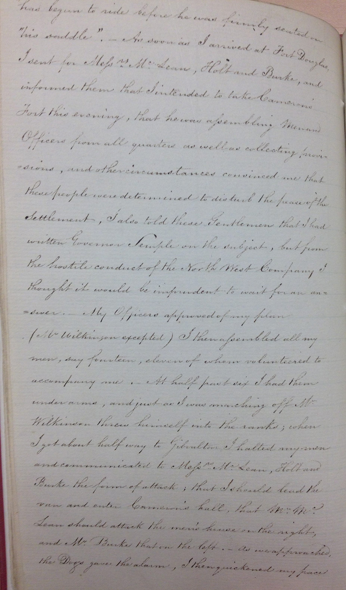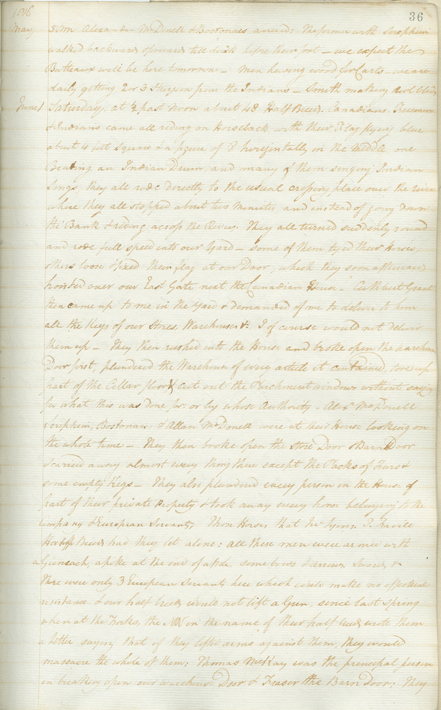 “at ½ past noon about 48 Halfbreeds, Canadians, Freemen & Indians came all riding on Horseback, with their Flag flying blue about 4 feet square & a figure of 8 horizontally in the middle, one beating an Indian Drum, and many of them singing Indian songs. They all rode directly to the usual crossing place of the river where they all stopped about two minutes... They all turned suddenly round and rode full speed into our yard – some of them tyed their Horses, others loose & fixed their flag at our Door, which they soon afterwards hoisted over our East Gate next to the Canadian House. Cuthbert Grant then came up to me in the yard & demanded of me to deliver to him all the keys of our Stores, Warehouses etc. I of course would not deliver them up – They then rushed into the House and broke open the Warehouse Door first, plundered the Warehouse of every article it contained, tore up part of the Cellar floor, & cut out the Parchment windows without saying for what this was done or by whose Authority.”