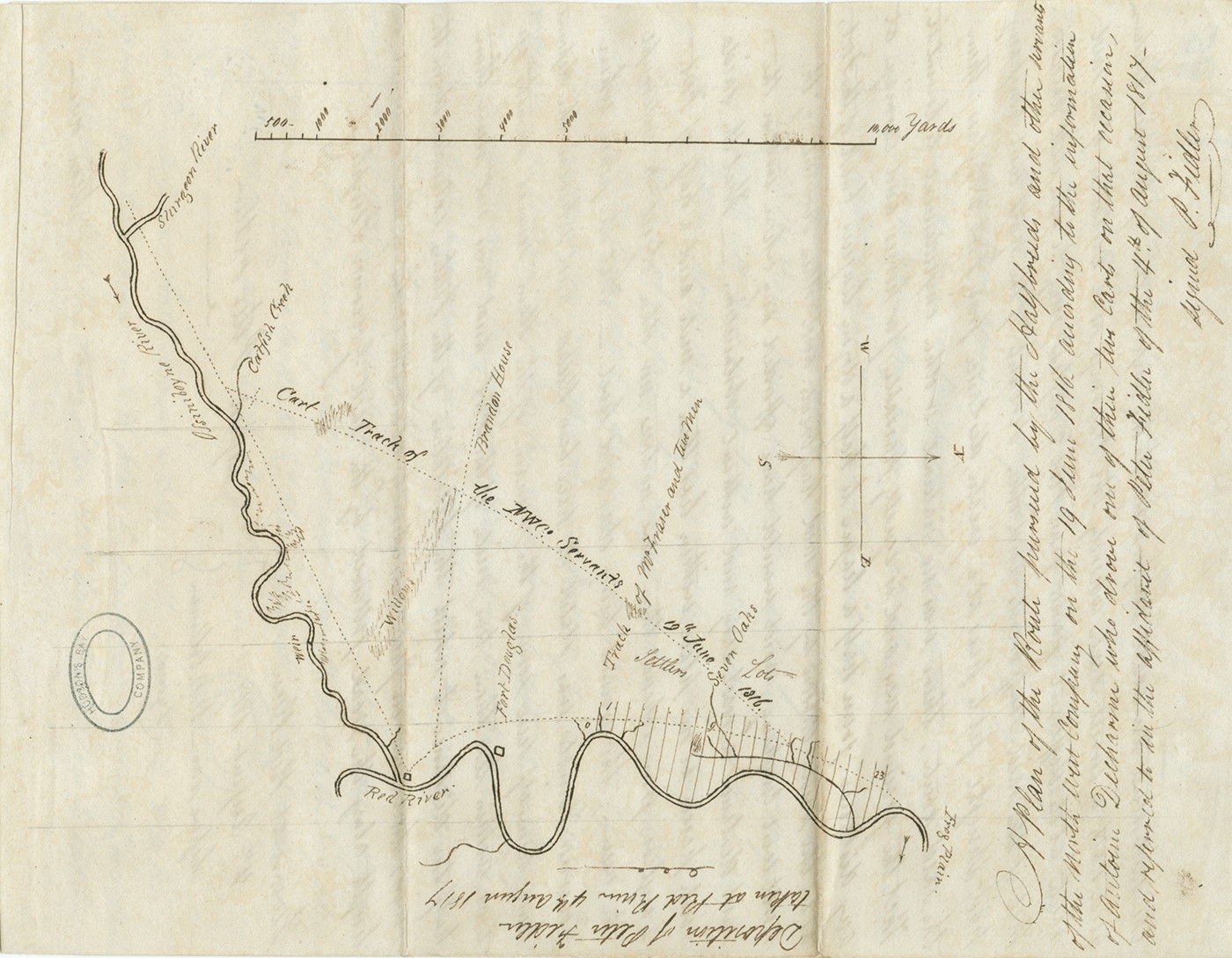 In July 1817, Fidler surveyed the cart route taken by Cuthbert Grant and his party after they left Brandon House as they travelled from Catfish Creek (now Omand’s Creek) to Frog Plain. Fidler had been accompanied by Antoin Descharme, who had driven one of the carts, along with other eye witnesses.