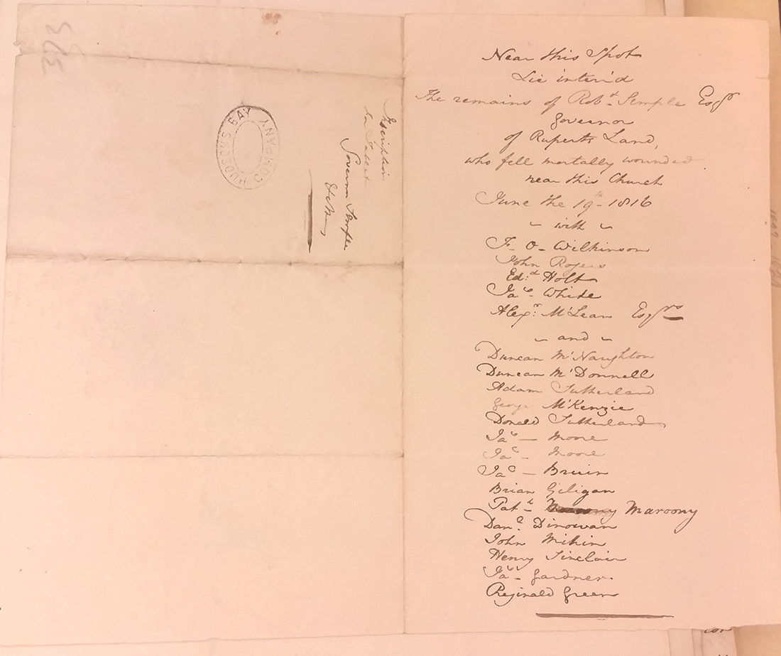 In 1823, John Halkett wrote a letter to Robert Pelly with the idea of putting a monument over the grave of Governor Semple. The letter included a draft, shown below, of what was to be etched on the monument. Along with Governor Semple are the names of 20 HBC men “who fell mortally wounded” on that day.