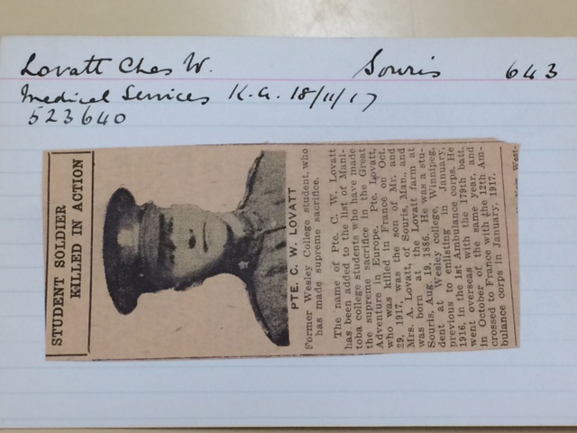 The Archives of Manitoba has created an electronic index of Manitoba soldiers killed in the First World War. This index was generated from a series of index cards created by the Government of Manitoba for the purpose of documenting Manitoba casualties of the First World War. The original index was made during and after the war but was not a complete record. As a result, this electronic index is also not a complete list of Manitobans killed in the First World War. (It would appear that many of the names on the cards were gathered from newspaper casualty lists. Death dates are often the same as those in the newspapers, including the same errors. Some of the men identified as killed were not – and likely reflect errors in the newspaper lists.)