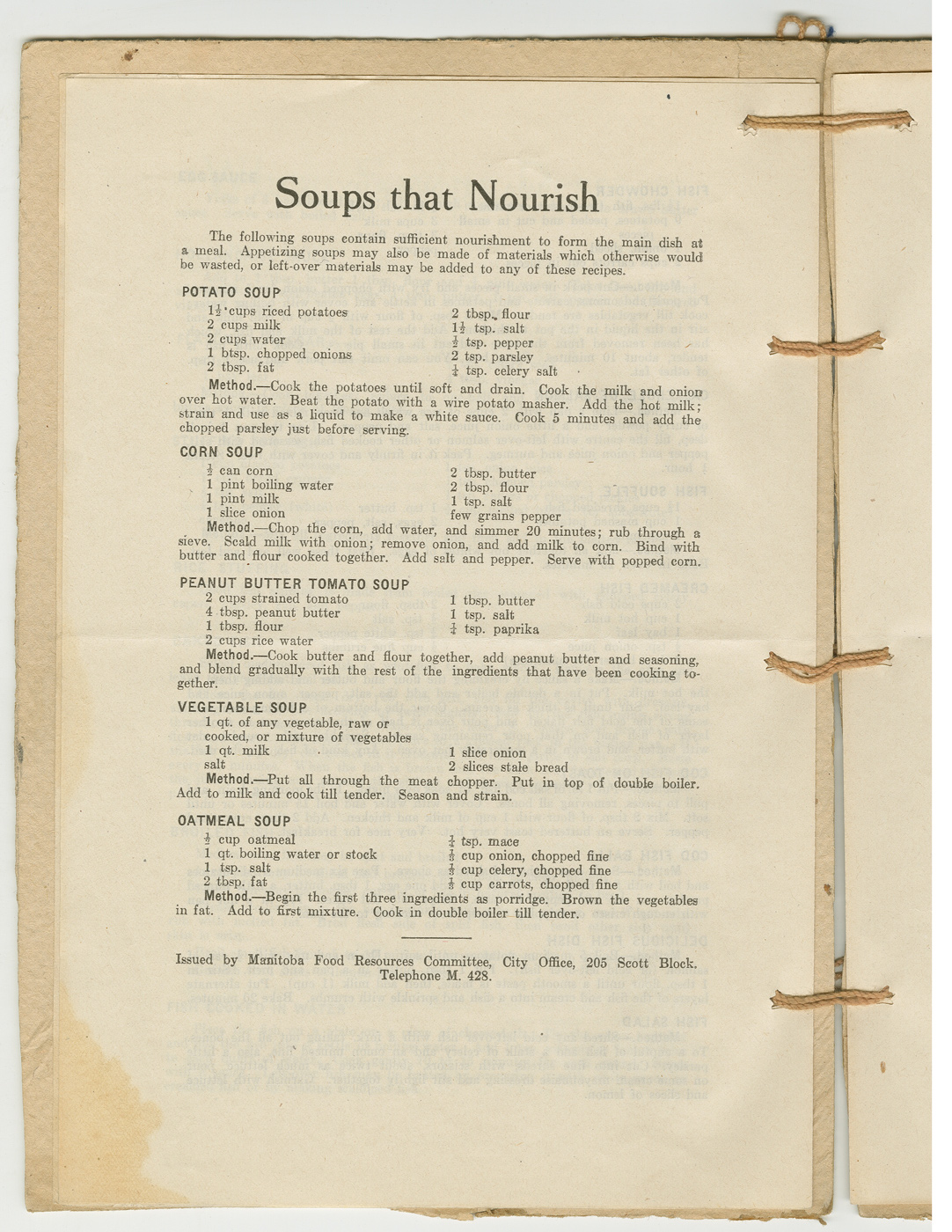 One of the most significant day-to-day effects on life at home during the First World War was the impact of rations. Food rationing essentially meant that only fixed amounts of foods like butter, sugar and eggs were available to individuals at home so that the remainder could be used to help men fighting overseas. The Archives has just one file of records from Gertrude Code, a member of the Local Council of Women, and they reflect her involvement in the war effort. Included in her records is a cookbook, “Wartime Cookery” created by the Recipe Committee of the Local Council of Women. If you want to eat like they did 100 years ago, have a look at some of the recipes. Featured here are “soups that nourish” including Peanut Butter Tomato Soup, Oatmeal Soup, and more!