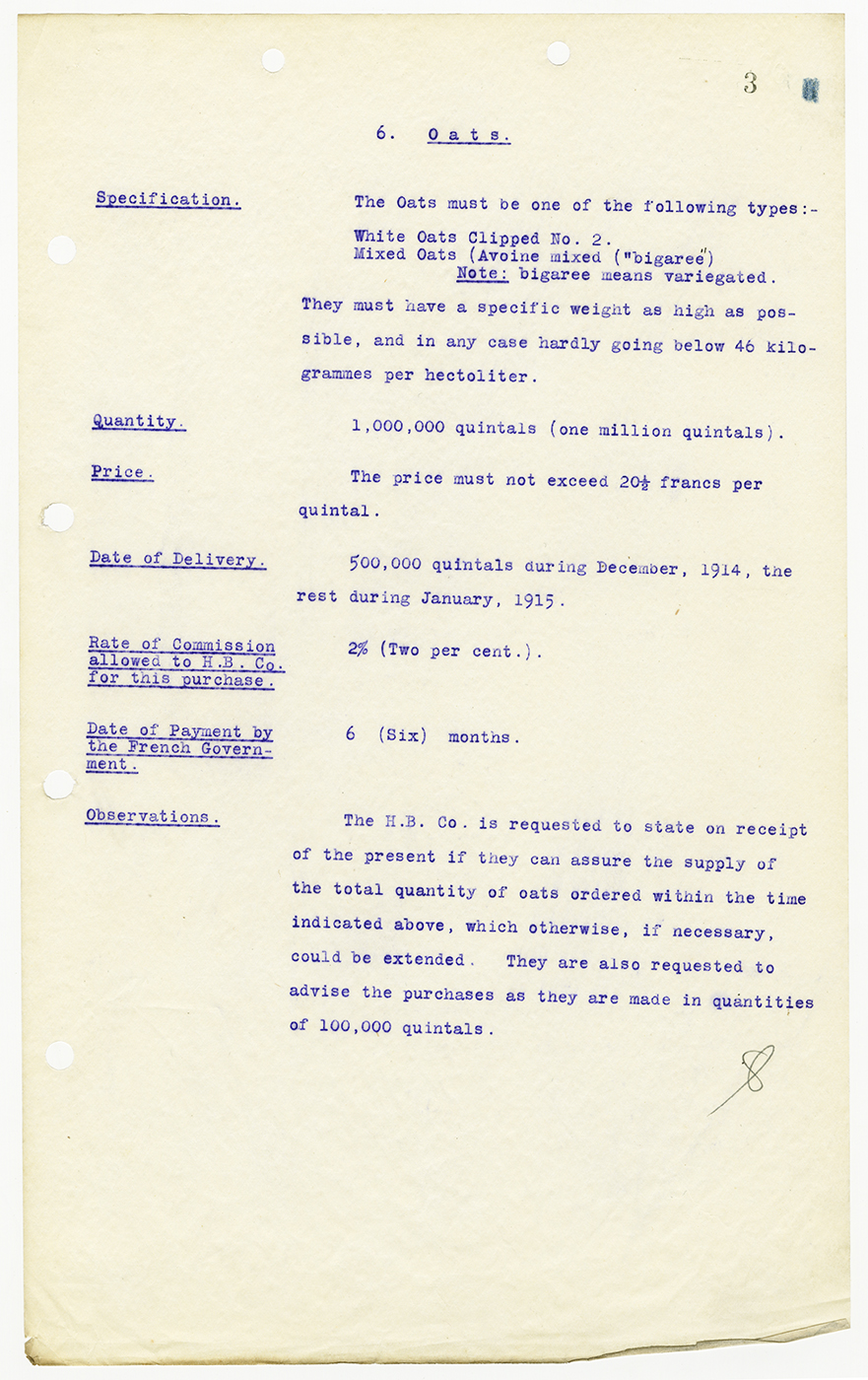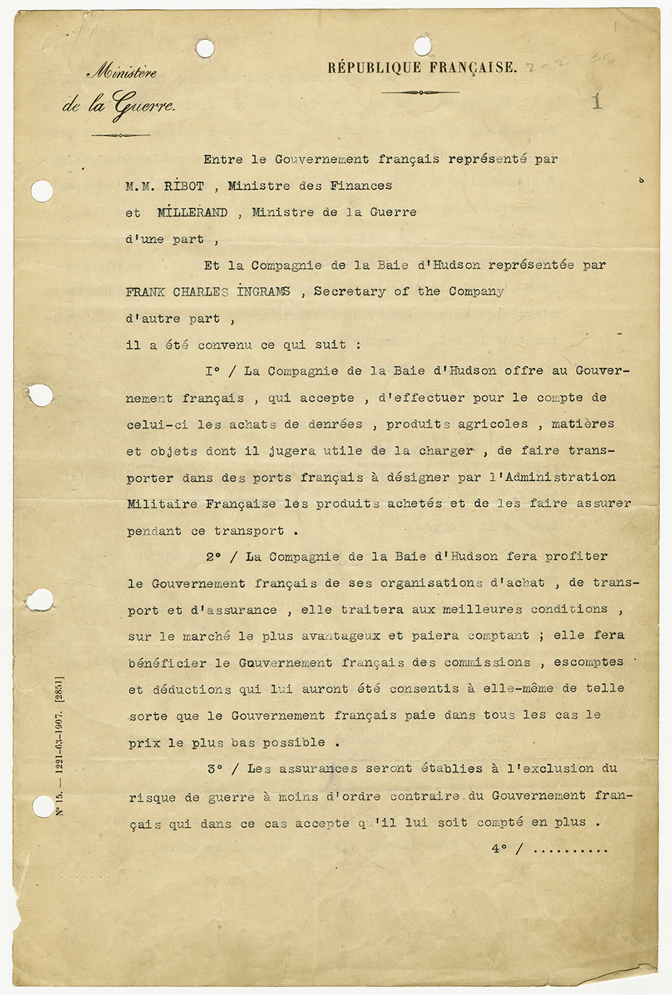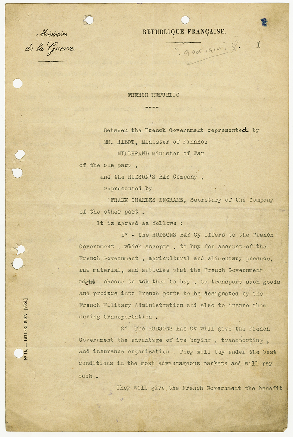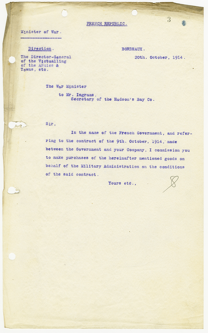 On October 20, 1914, the Hudson’s Bay Company received its first purchasing order from the Director-General of Victualling of the Armies and Towns, on behalf of the French government’s Ministry of War. Orders like this resulted from the agreement signed between the HBC and the French government in the early months of the First World War.