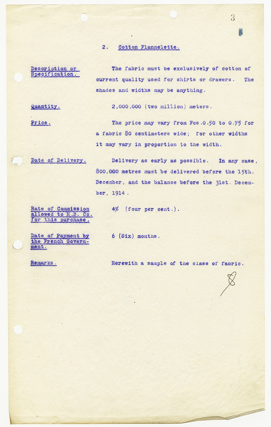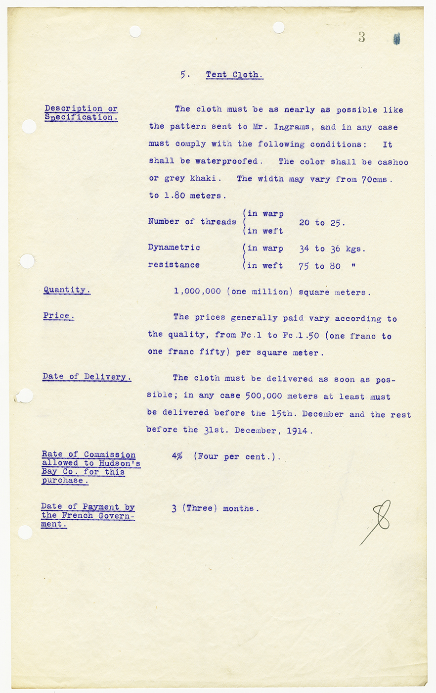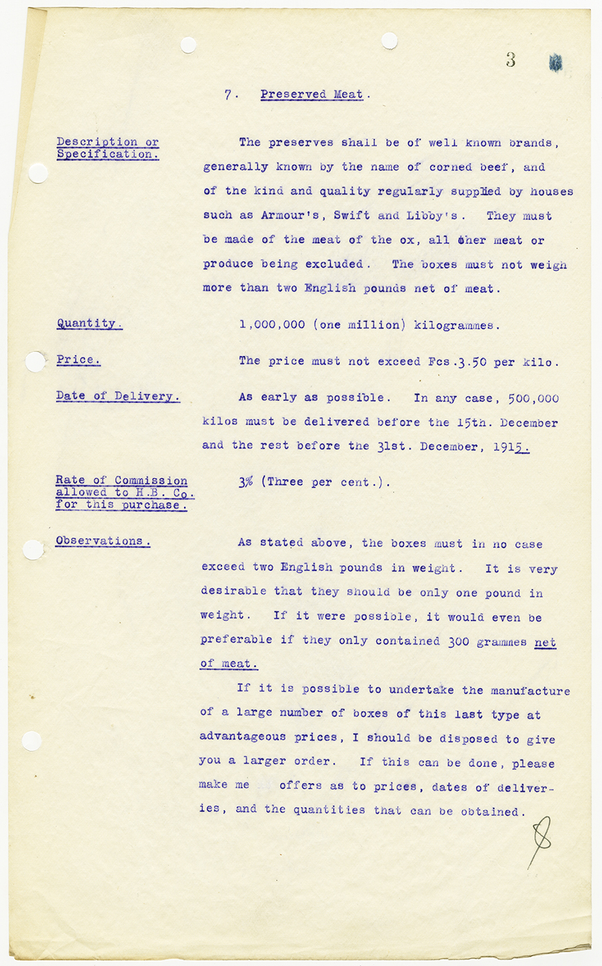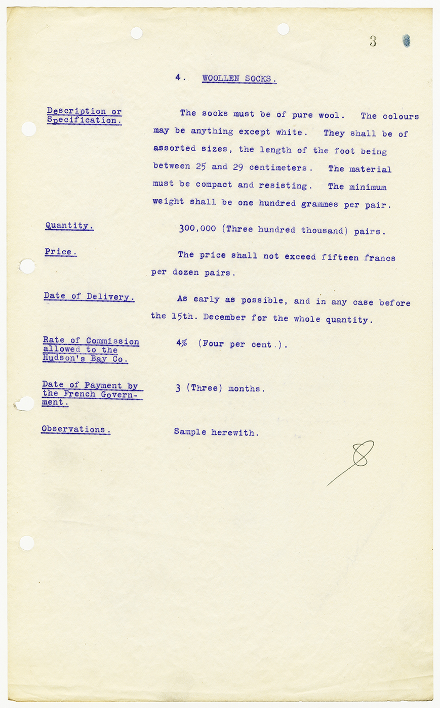 On October 20, 1914, the Hudson’s Bay Company received its first purchasing order from the Director-General of Victualling of the Armies and Towns, on behalf of the French government’s Ministry of War. Orders like this resulted from the agreement signed between the HBC and the French government in the early months of the First World War.