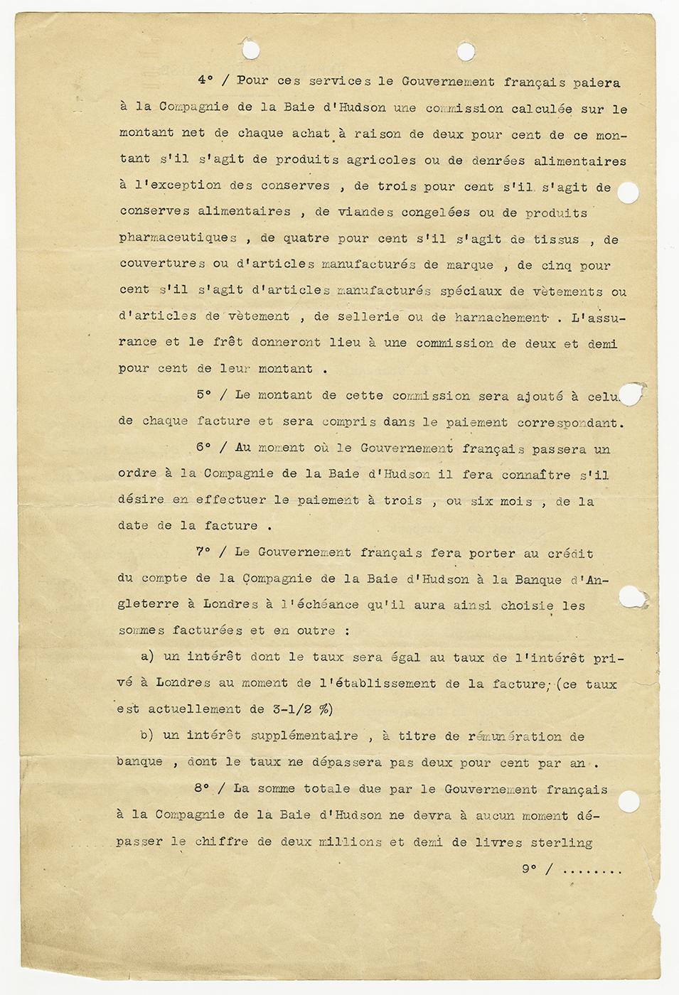 The following is an agreement dated October 9, 1914 that is signed between the HBC and the Government of France, written in both French and English. In it, the HBC was appointed the French government’s purchasing agent for food stuffs, raw materials and manufactured goods. The HBC was also charged with organizing the transportation of goods and produce to designated French ports. Similar agreements were later signed with the Belgian, Russian and Romanian governments. During the course of the war, the HBC organized a merchant fleet of several hundred ships, which transported over 13 million tons of goods, as well as soldiers, refugees and escaped prisoners of war.
