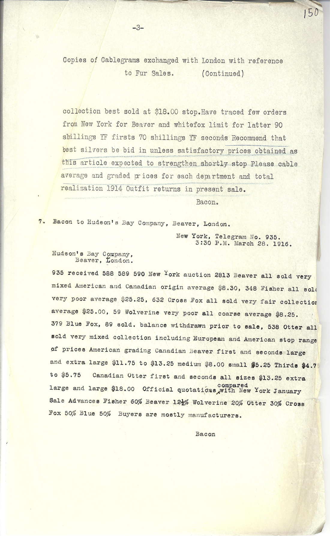 Two years later, his position is completely reversed. In a letter to Hudson’s Bay Company’s Governor Kindersley in 1916, Bacon reports that exports to the United States are now “five to six times in value to those taken by Great Britain” and that a failure to adapt to the situation was “certainly putting the company at an enormous disadvantage”.