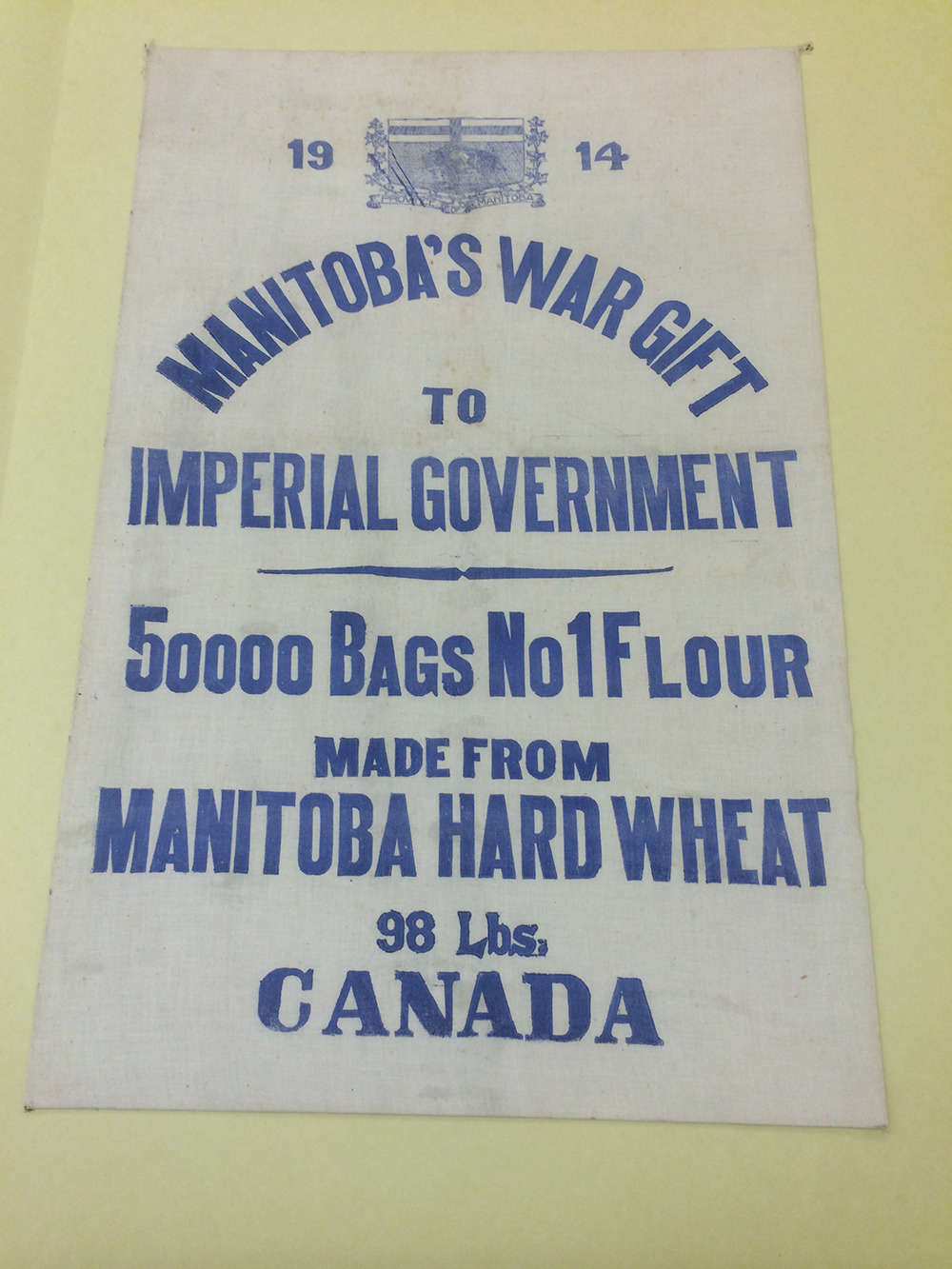 In September 1914 the Manitoba Government offered a gift of 50,000 bags of Manitoba flour to the Imperial Government to help with the war effort by providing food to Britain. The flour was made from Manitoba No.1 hard wheat.