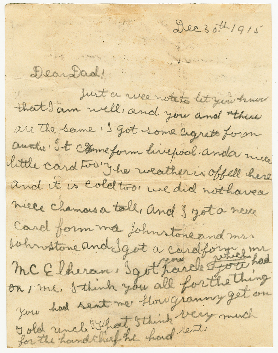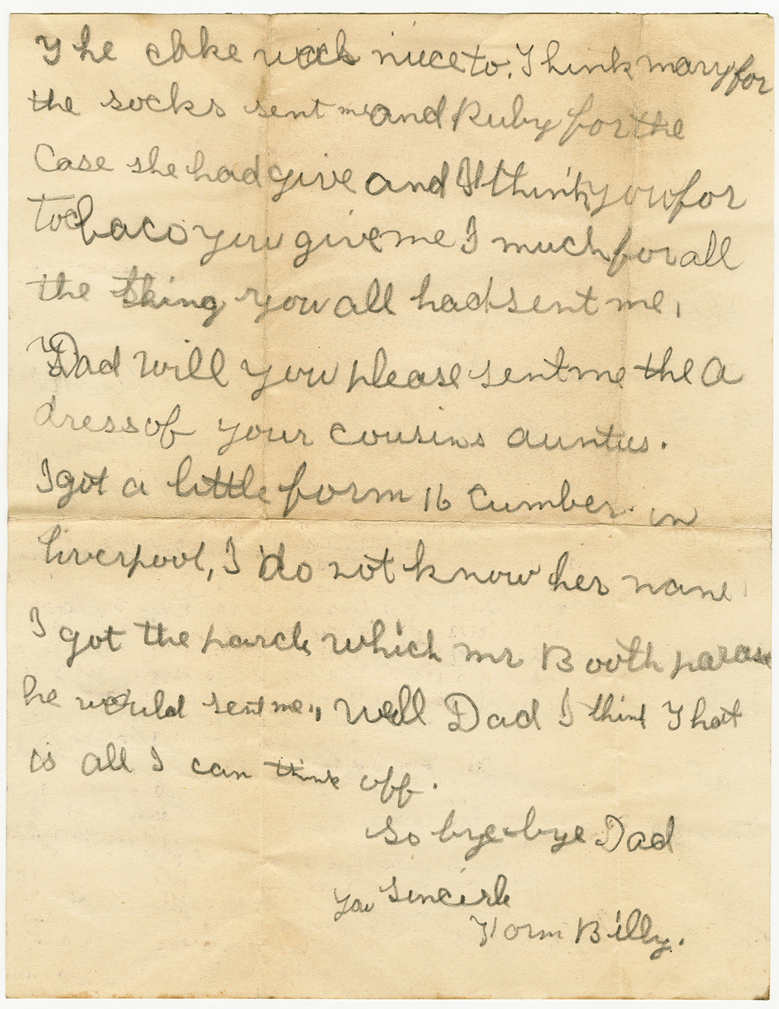 Billy’s letter is difficult to read due to his grammar and spelling levels. He starts his letter to “Dear Dad” with “Just a wee note to let you know that I am well…” and informs his father that the weather is “offell [sic] here and it is cold too.” He goes on to thank his father and other family members for items sent recently in a parcel (cigarettes, handkerchief, cake, socks and tobacco case).