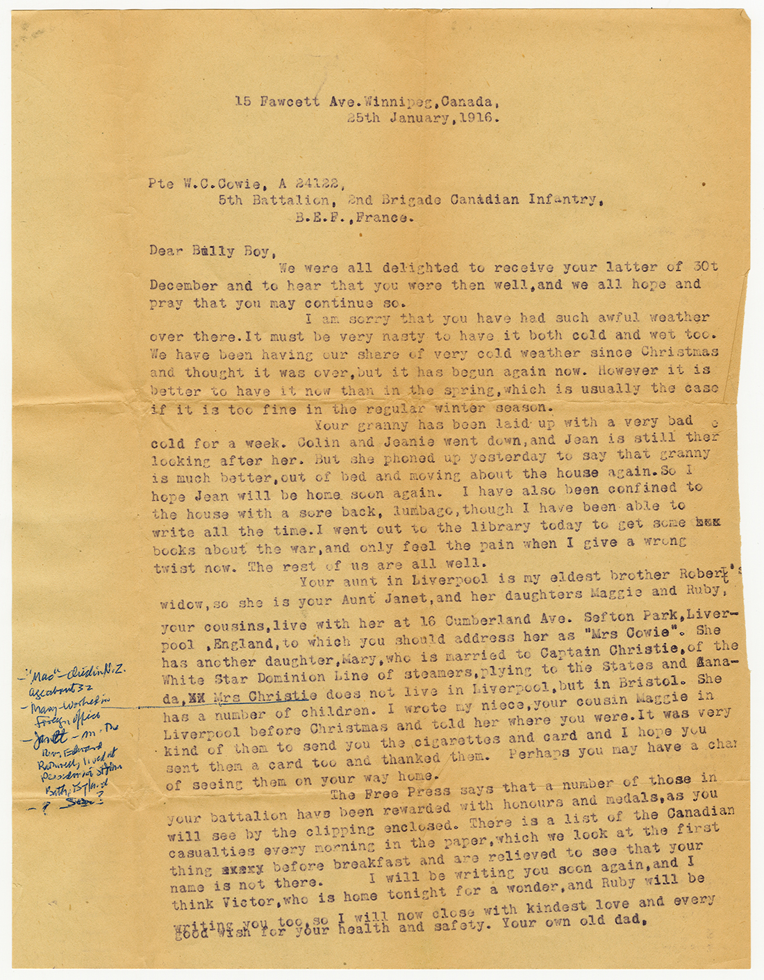 At Christmas time during the First World War, families would have been thinking of their loved ones who were overseas serving in the armed forces. They sent letters, cards and parcels and the soldiers sent letters and cards home in return. The Isaac Cowie fonds are found in the Hudson’s Bay Company Archives and include correspondence between Isaac and his son Billy (sometimes called Bill, Billy Boy or Willy). Included here are a letter dated 30 December 1915 from Billy to his father and the response dated 25 January 1916 from his father.