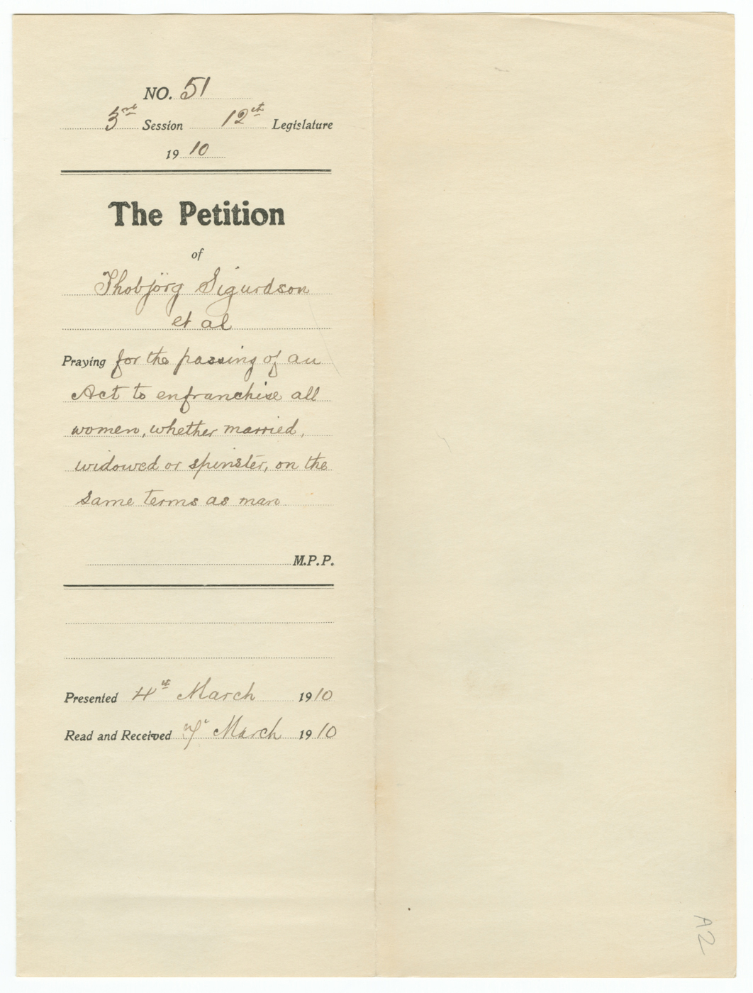 In February 1910, members of Sigurvon collected over 1100 signatures in support of a woman having “the full franchise extended to her on the same basis as that of man.” The collected petitions were given to the MLA for Gimli, Sigtryggur Jonasson, and were read in the Manitoba Legislature in March 1910. These petitions are part of the Sessional Papers held at the Archives of Manitoba which document the business of the Legislative Assembly and include reports tabled in the House, Ministers’ statements, committee reports and petitions, among other records.