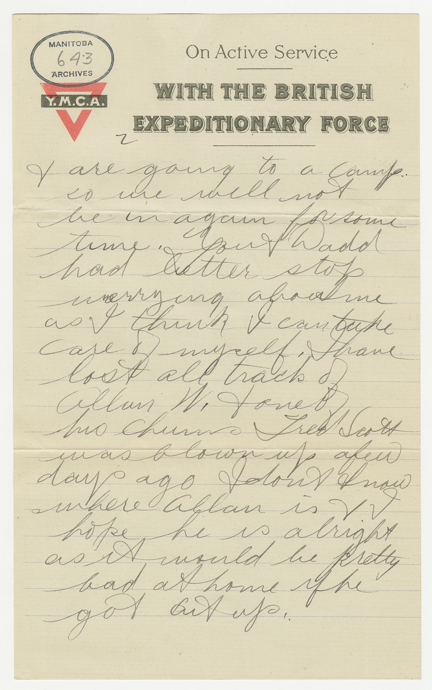 “I [seen] Allan W. about two days ago + he was fine and dandy but one of our bunch in the R.C.R. [Royal Canadian Regiment] got it + Jack Stevens got his hand blown off.”