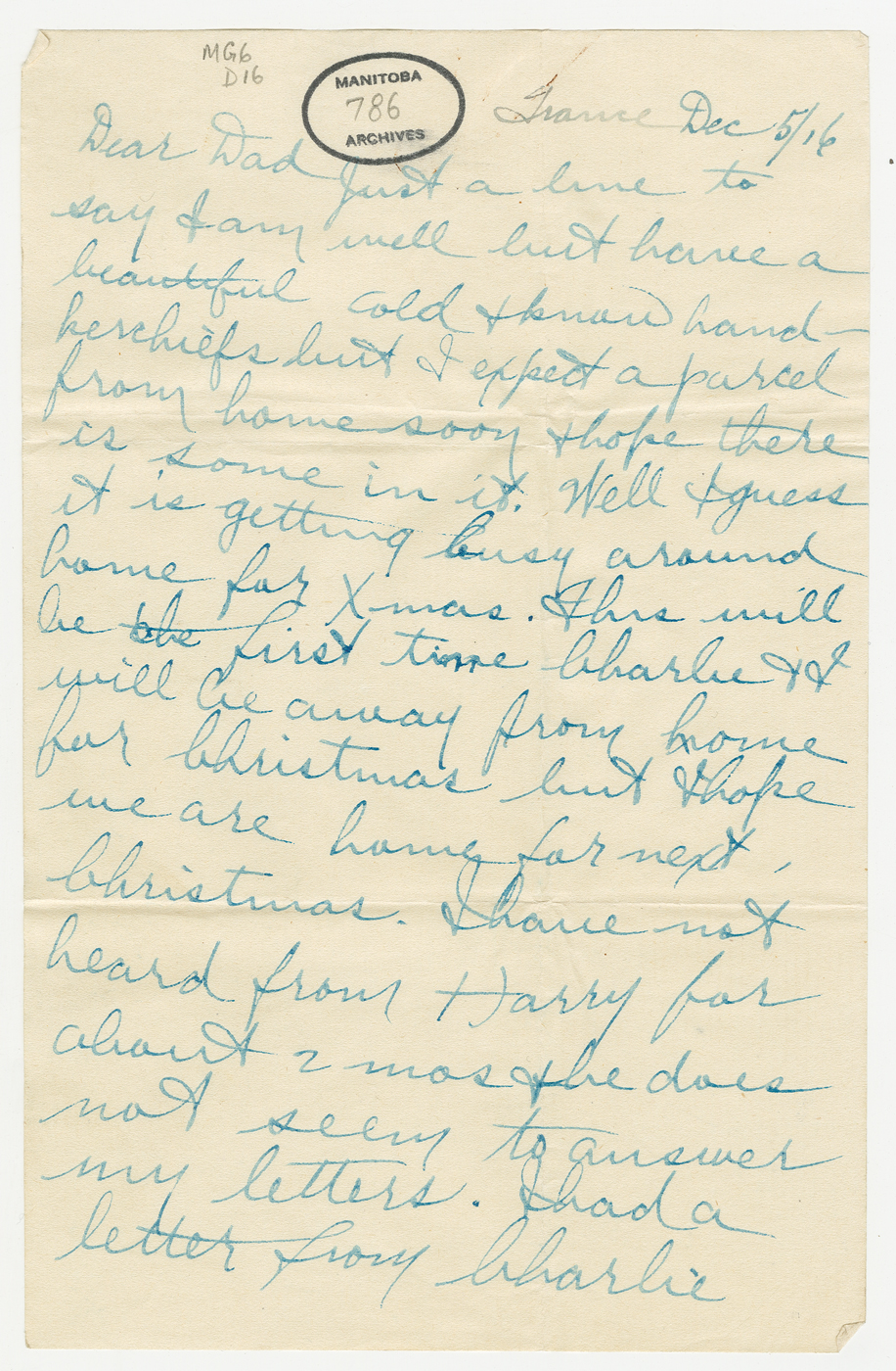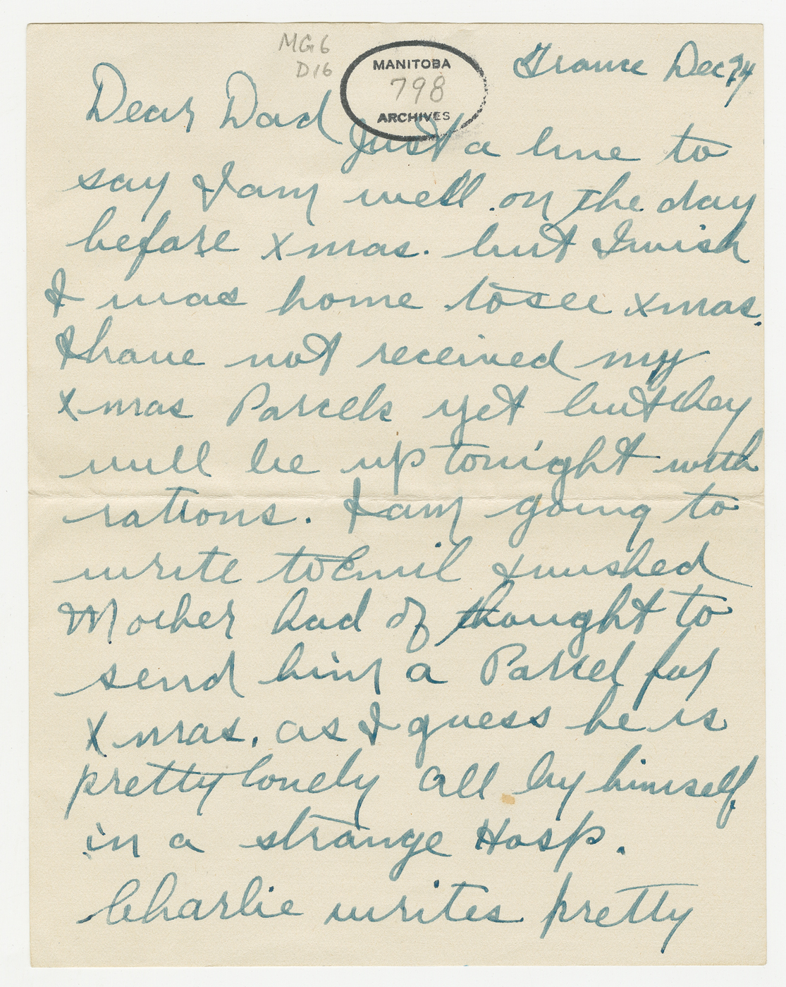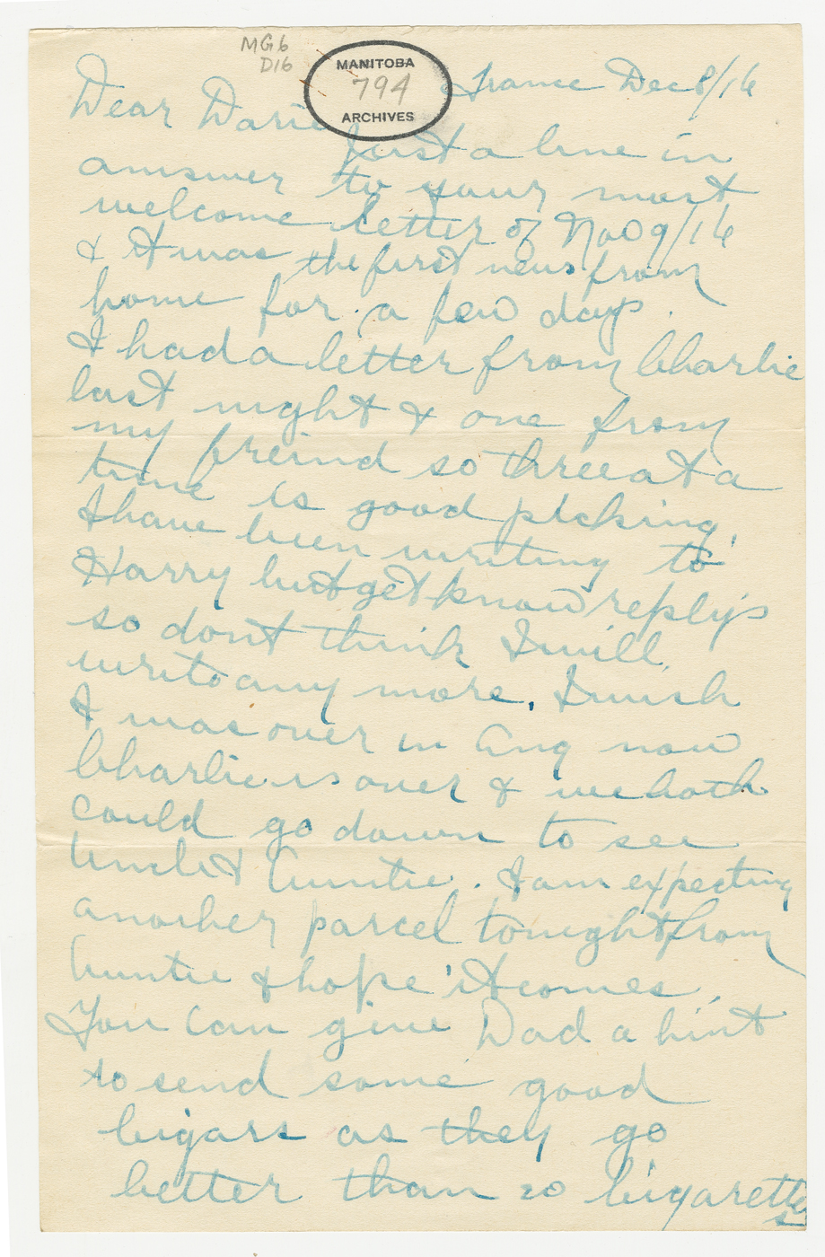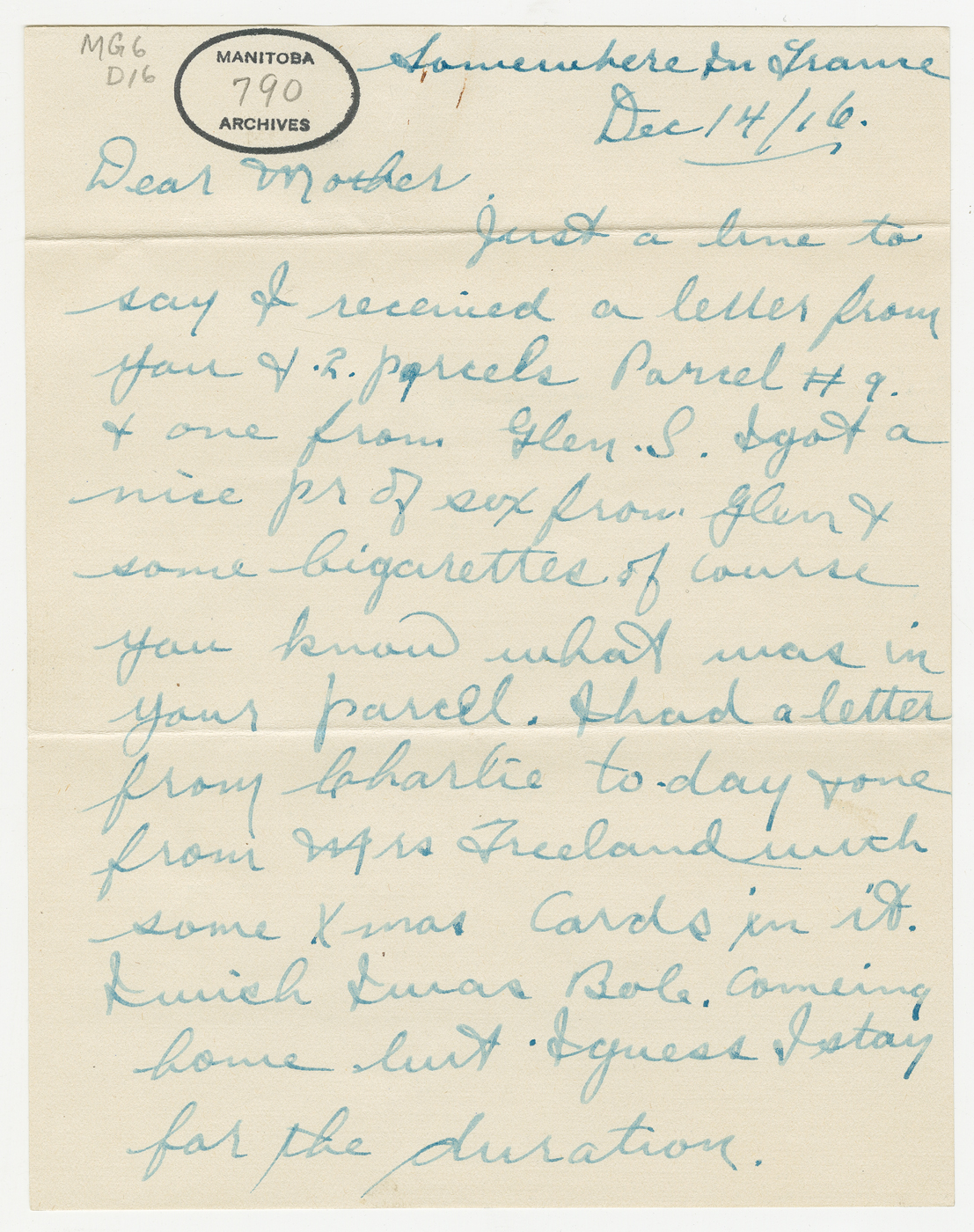 - 12 December: One Manitoba Soldier: Letters and parcels