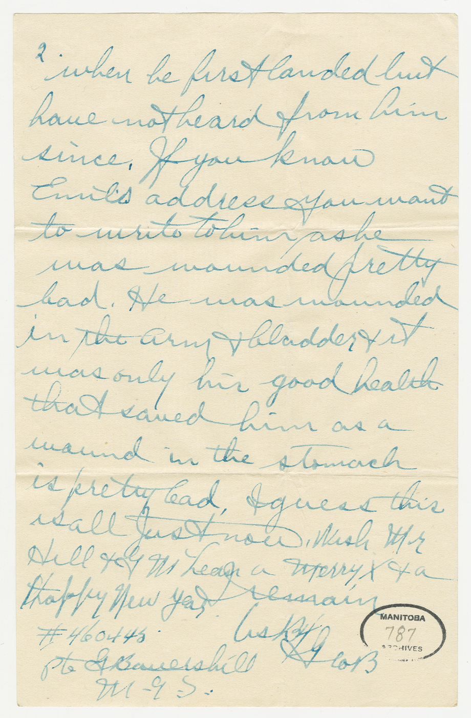 “If you know Emil’s address you want to write to him as he was wounded pretty bad. He was wounded in the arm + bladder + it was only his good health that saved him as a wound in the stomach is pretty bad.”