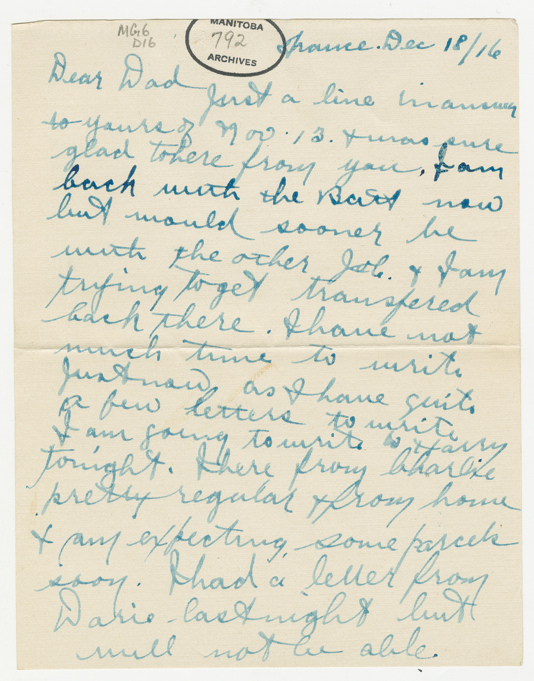 In his letter to his sister Dorie, dated 18 December 1916, he writes: