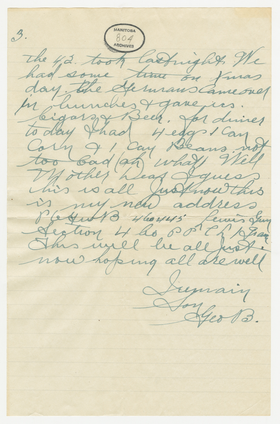 “Well Mother dear, this has been a much different Xmas than last one but it has not been too bad. We were in the trenches for Xmas but are in huts just now + we are spending New Years Day pretty good. One of them parcels was from Carrie + one from you. On the back of one of the cards is #10 mailed Nov. 11th/16. Tell Carrie I wrote to her last night + don’t send any more cigarettes as I have quit smoking all together as it don’t agree with me. I have just seen some prisoners that the 42 took last night. We had some time on Xmas day. The Germans came over in bunches + gave us cigars + beer. For dinner today I had 4 eggs, 1 can corn + 1 can beans. Not too bad (ah what). Well Mother Dear I guess this is all just now.”